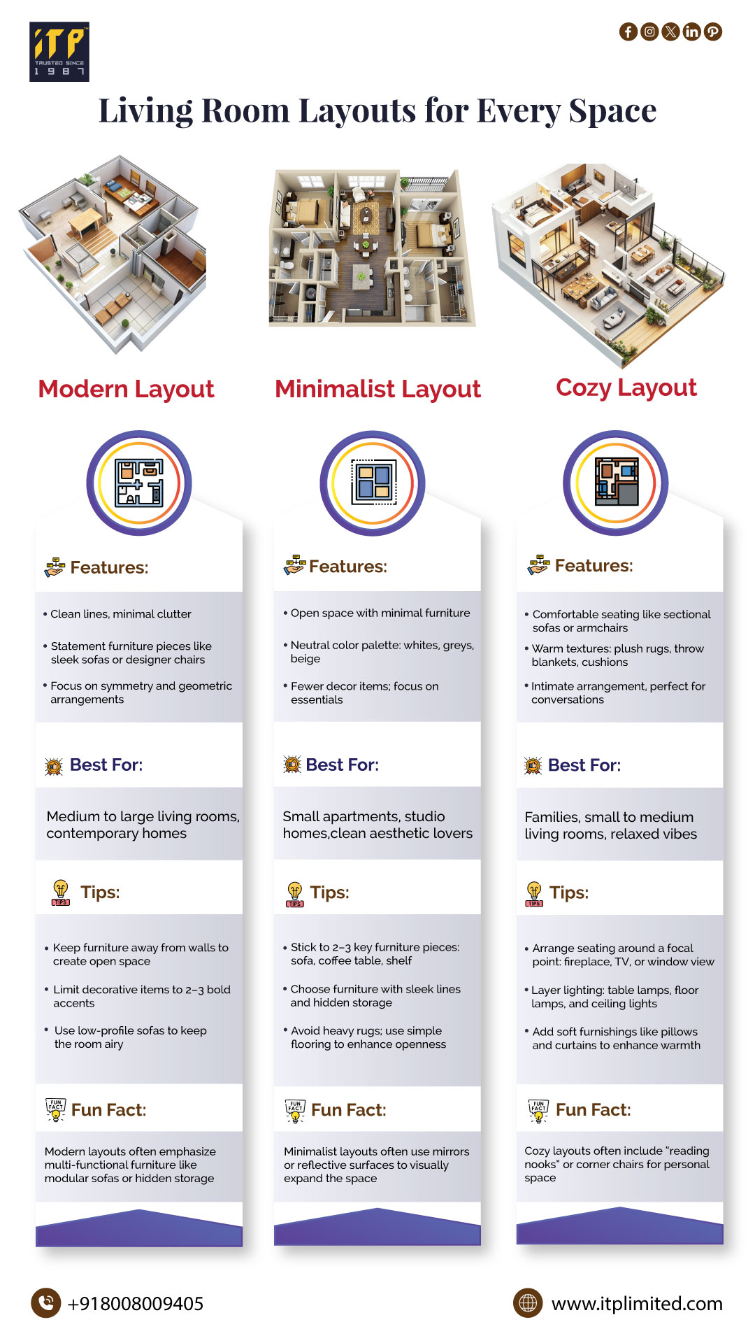 Discover expert living room layout ideas in Hyderabad & India with ITP. From modern to cozy designs, we offer trusted interior solutions. Create beautiful, functional spaces today! Call +91 8008009405 or visit www.itplimited.com for details.