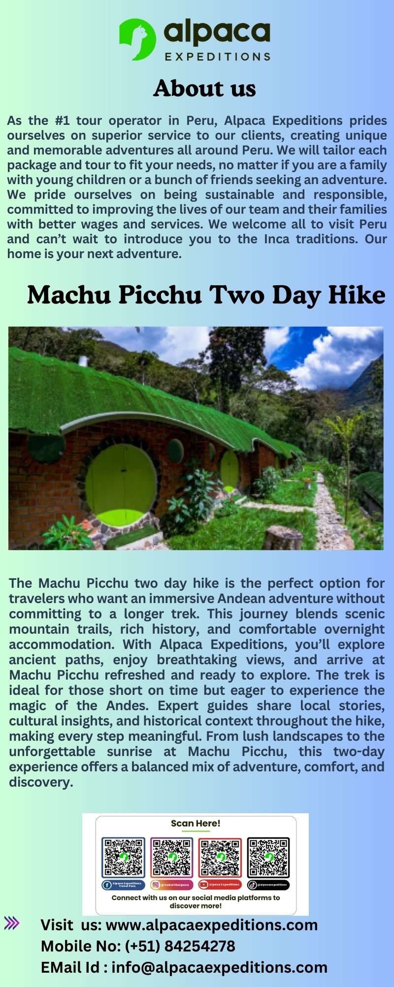 The Machu Picchu two day hike is the perfect choice for travelers who want adventure without a long trek. With Alpaca Expeditions, this short but rewarding journey combines stunning Andean scenery, rich history, and comfort. On day one, you’ll explore beautiful trails, visit ancient sites, and enjoy breathtaking mountain views. Day two is dedicated to discovering the iconic Machu Picchu with a guided tour that brings the lost city to life. Ideal for beginners, families, and time-limited travelers, this hike offers an unforgettable experience without extreme physical demands. With expert guides, quality accommodations, and responsible tourism practices, Alpaca Expeditions ensures your Machu Picchu adventure is safe, enriching, and truly memorable.