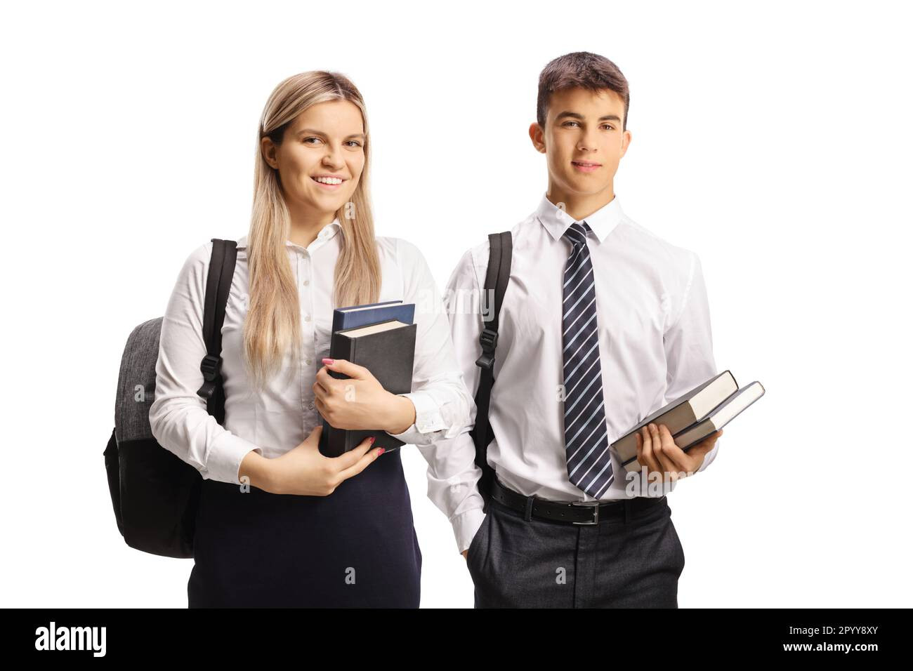 male and female students in a uniforms holding books isolated on white background 2PYY8XY