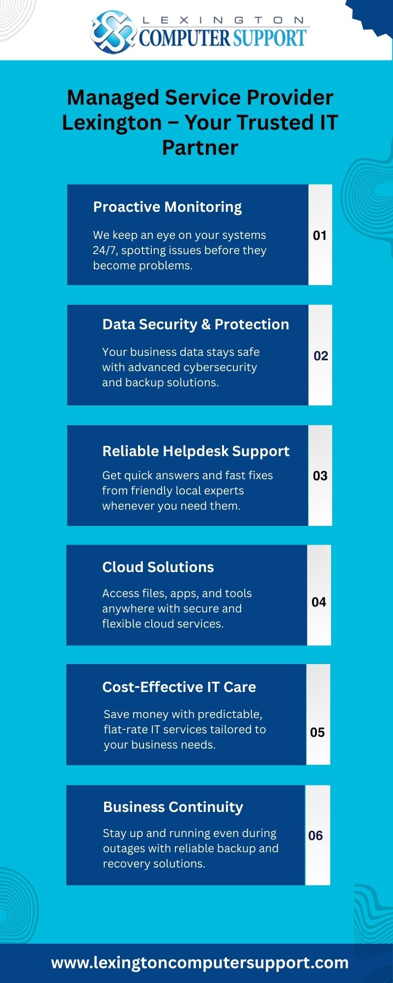Technology should make your business run smoother, not create extra stress. That’s where our team at Lexington Computer Support comes in. As your local Managed Service Provider, we deliver reliable IT solutions tailored to your needs.