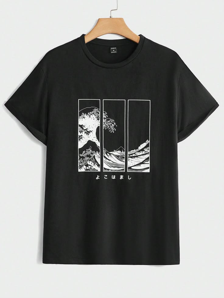 Men Cotton Japanese Letter & Wave Print Tee
