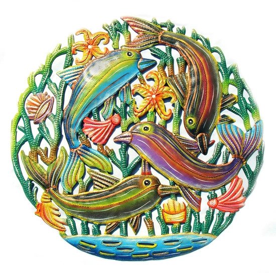 metal drum art coastal playful dolphins