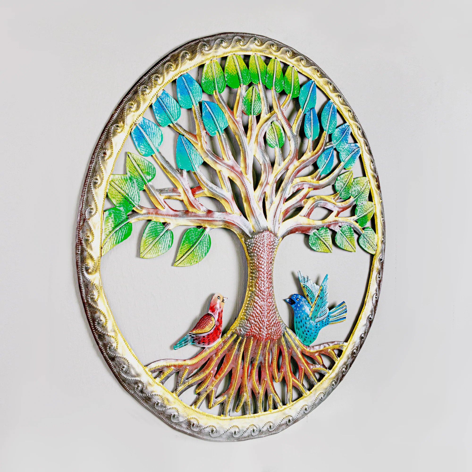 metal drum art framed tree with birds painted 2