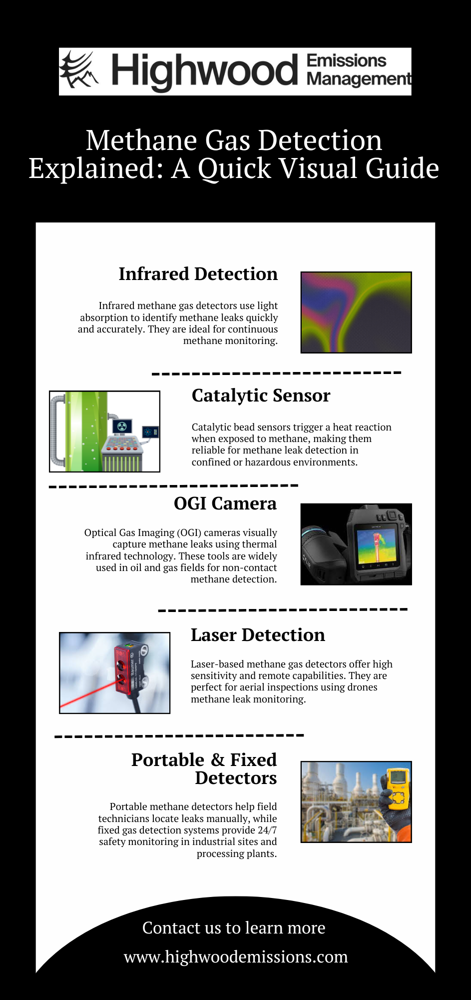 Explore how methane gas is detected using advanced technologies like infrared methane detectors, catalytic sensors, and laser-based leak detection tools. This infographic provides a clear overview of methane leak detection methods used across oil & gas, landfill, and industrial facilities. View the full infographic now and take control of your emissions.