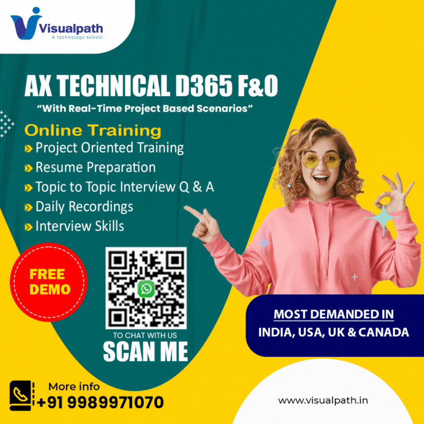 Dynamics 365 Online Training - Visual Path offers the Best D365 Ax Technical Online Training conducted by real-time experts.Our Dynamics 365 Online Training  is available in Hyderabad and is provided to individuals globally in the USA, UK, Canada, Dubai, and Australia. Contact us at+91-9989971070.