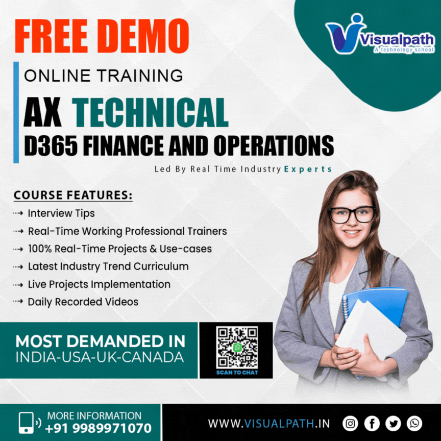 Dynamics 365 Online Training - Visual Path offers the Best D365 Ax Technical Online Training conducted by real-time experts.Our Dynamics 365 Online Training  is available in Hyderabad and is provided to individuals globally in the USA, UK, Canada, Dubai, and Australia. Contact us at+91-9989971070.