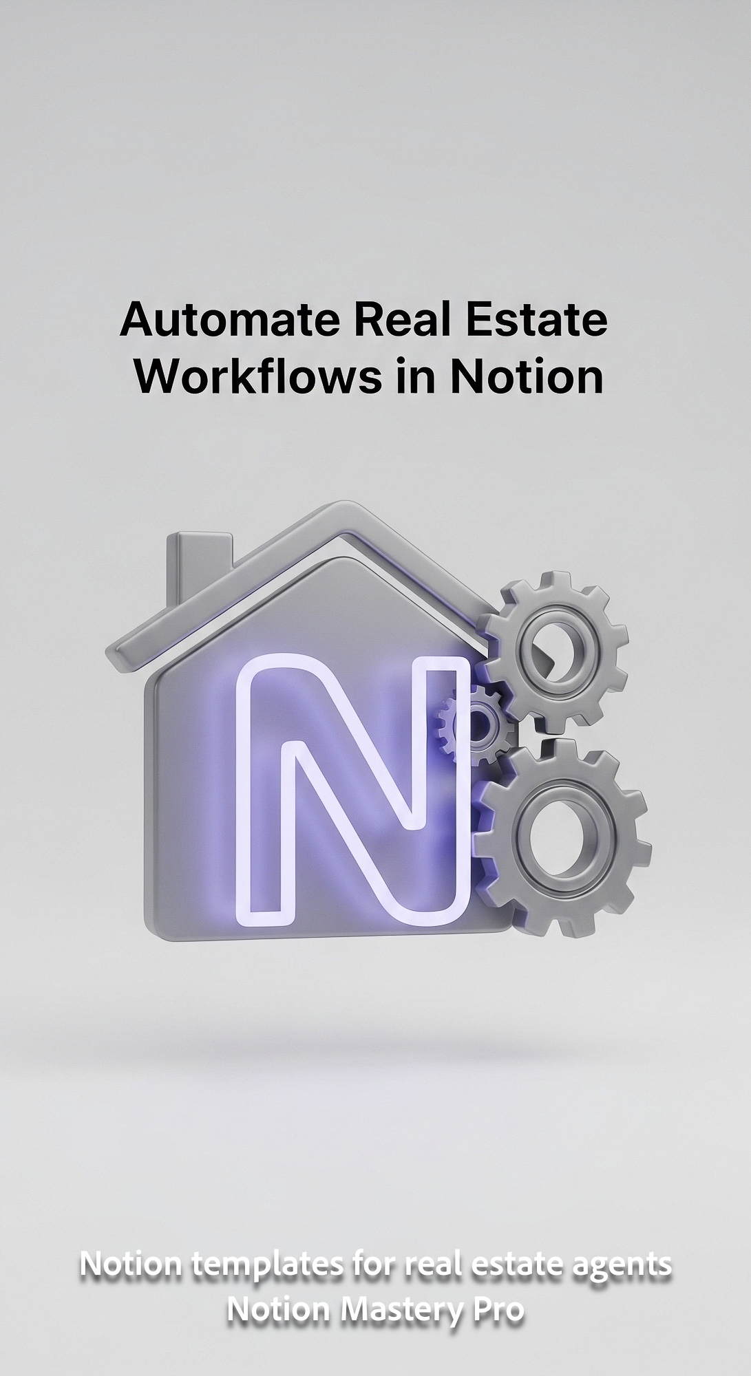 Minimalist 3D icon of a house and an interlocking gears symbol with a prominent glowing N Overlay Au