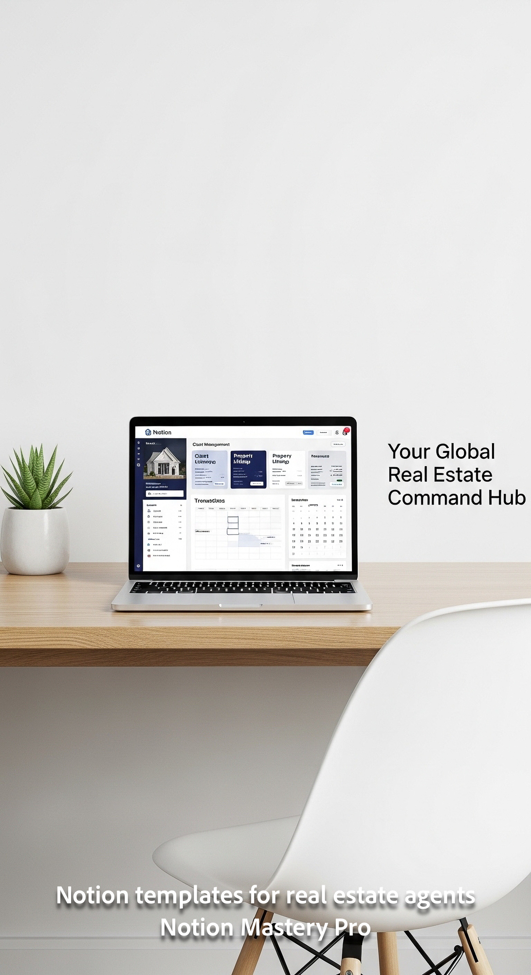 Minimalist desk with a designer chair and a laptop showing a Notion realtor OS Overlay Your Global R