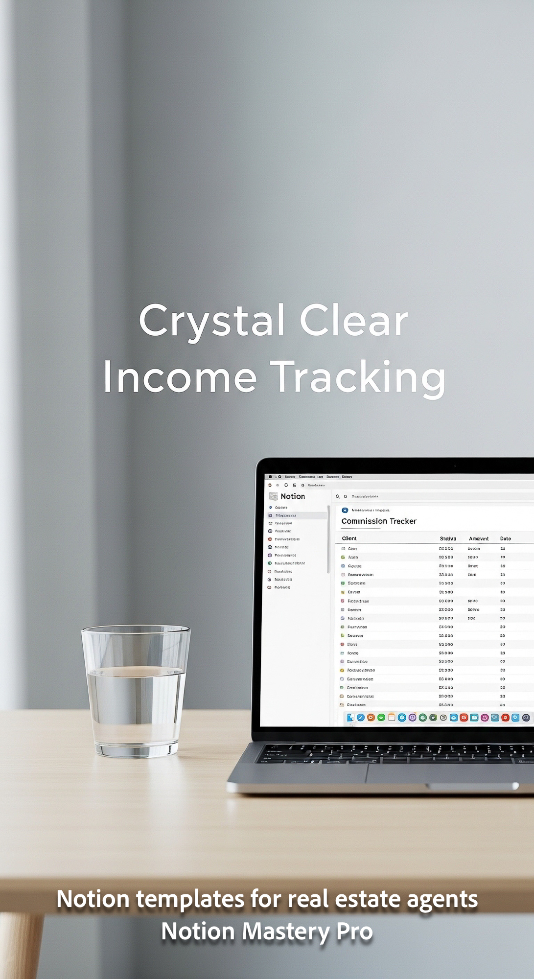 Minimalist desk with a glass of water and a MacBook showing a Notion commission database Overlay Cry