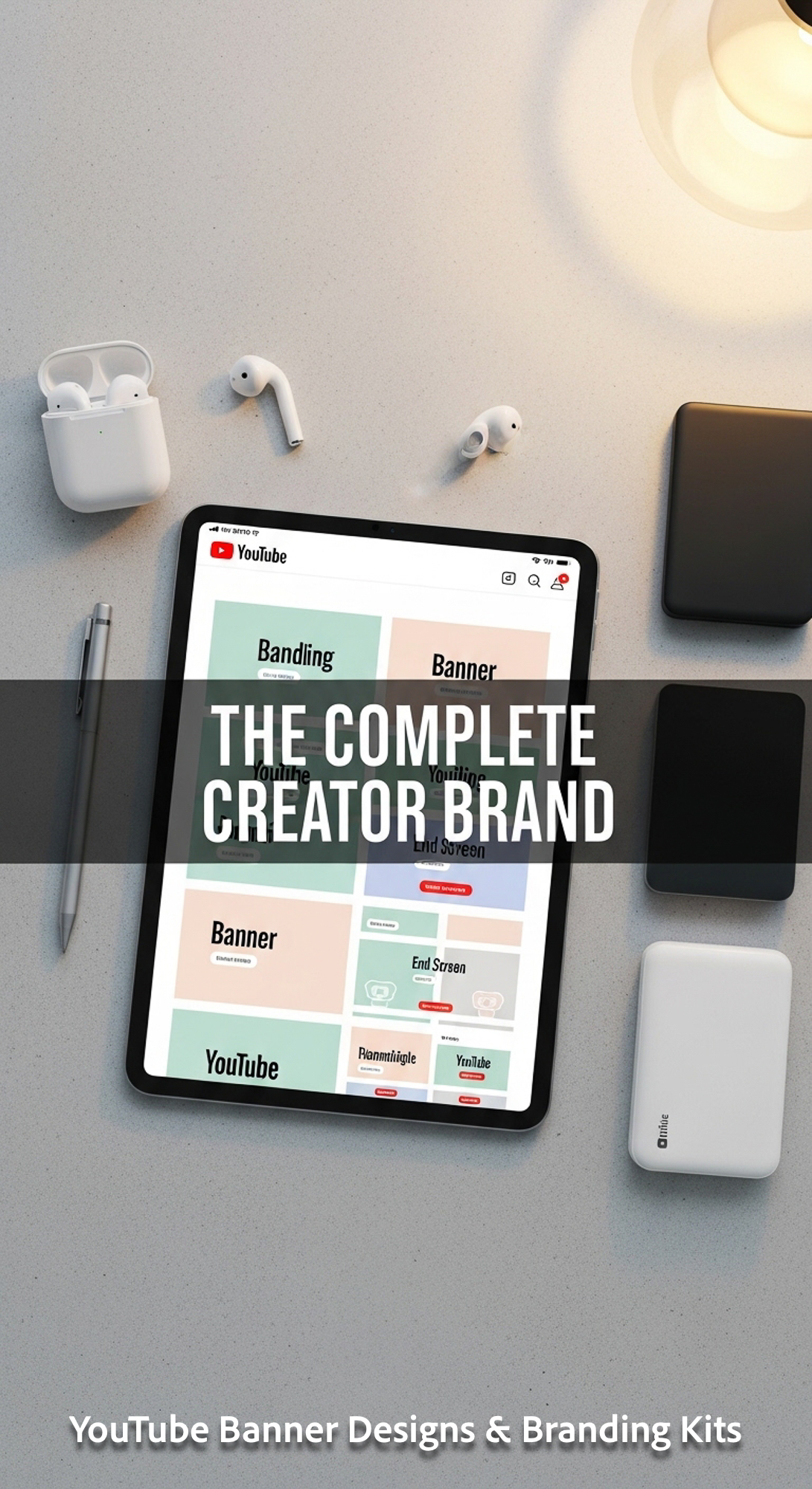 Minimalist flat lay of tech gear and a tablet showing a cohesive YouTube branding kit overlay text T