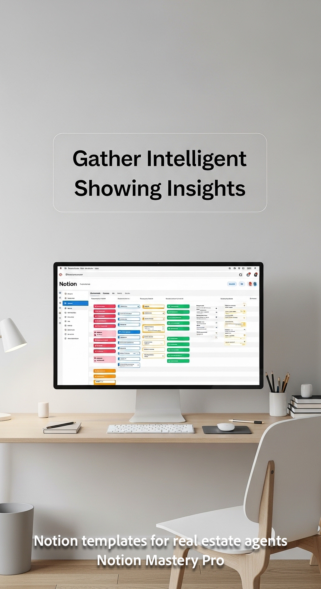 Minimalist workspace with a clean aesthetic a large monitor displaying a colorful Notion showing fee