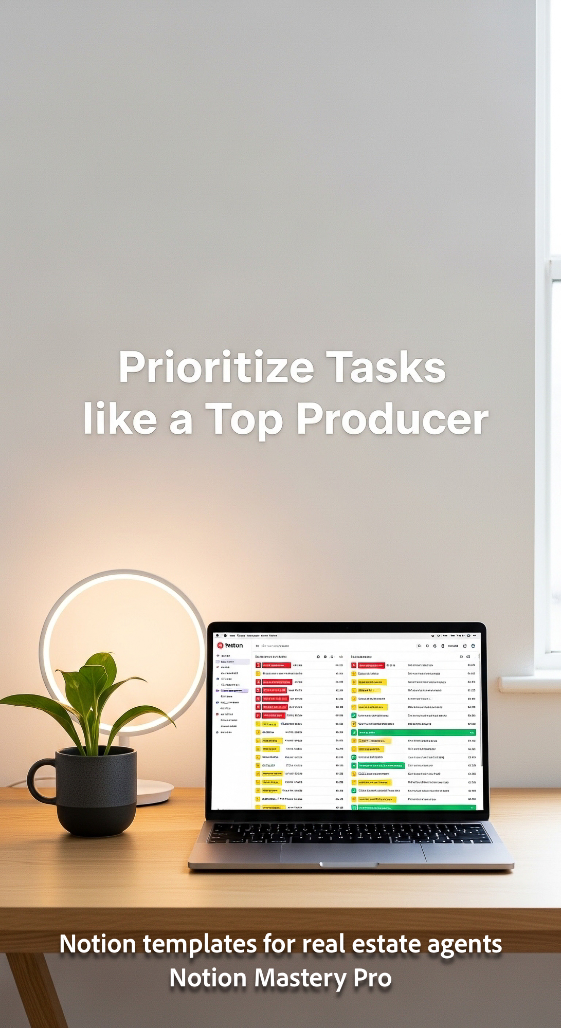 Minimalist workspace with a clean aesthetic screen displaying a detailed Notion task management data