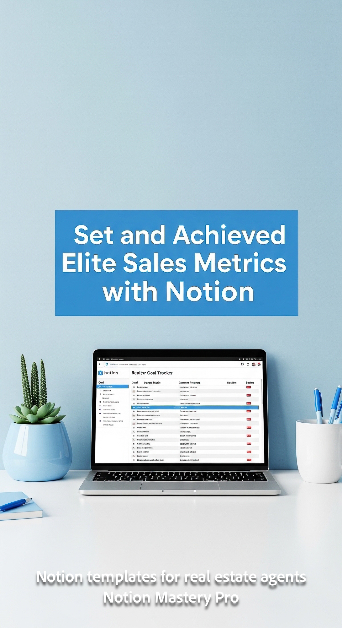 Minimalist workspace with a clean blue and white aesthetic screen displaying a detailed Realtor goal