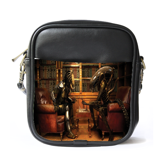 MiniSling0012 Mini Sling Bag Shoulder Bag Aliens VS Predator Playing Chess At Library