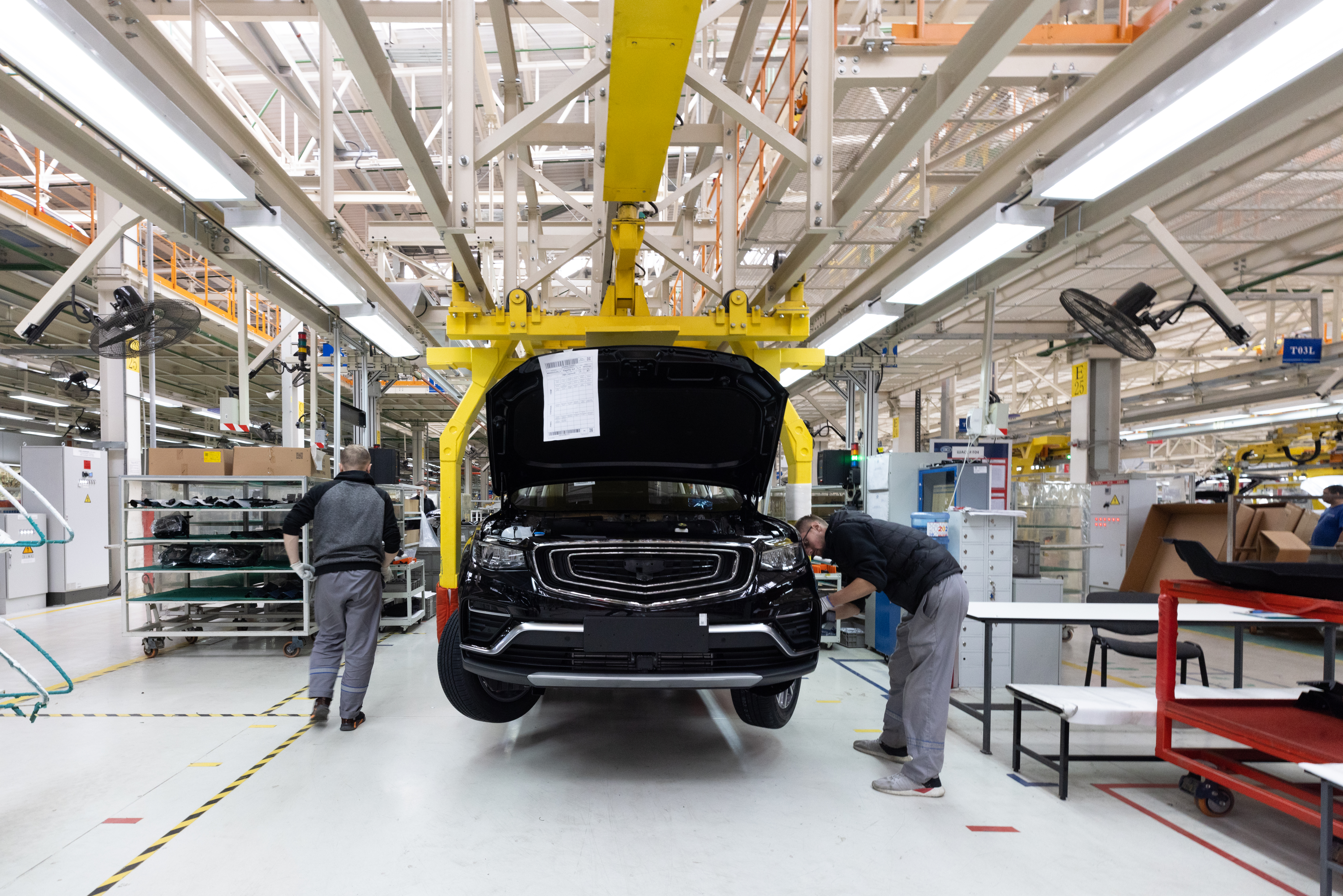 Minsk, Belarus - Dec 15, 2021: Automobile production line. Welding car body. Modern car assembly pla