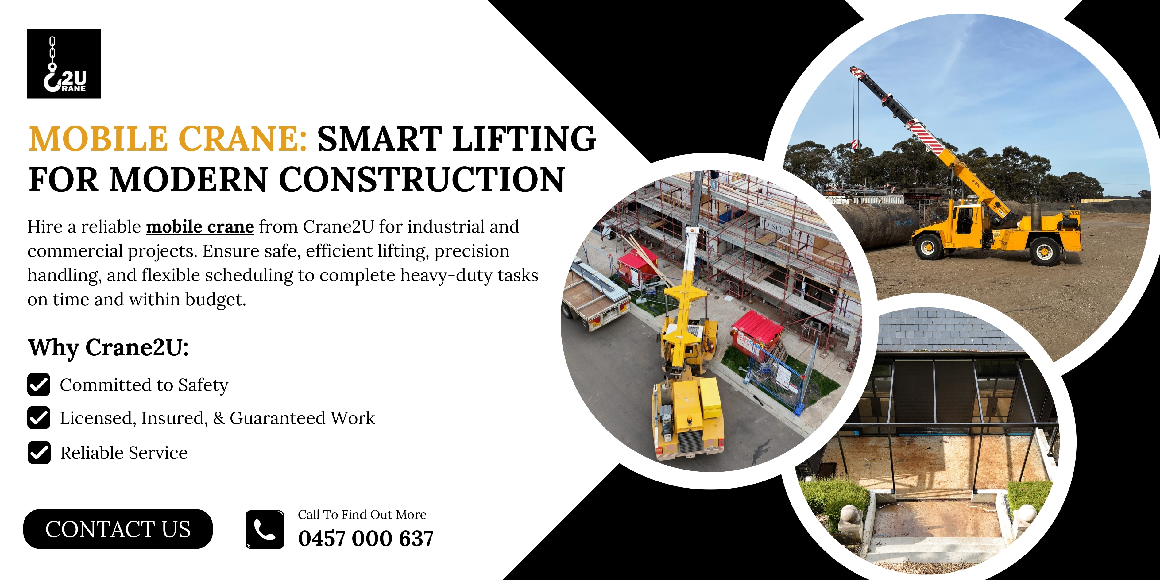 Hire a reliable mobile crane from Crane2U for industrial and commercial projects. Ensure safe, efficient lifting, precision handling, and flexible scheduling to complete heavy-duty tasks on time and within budget.