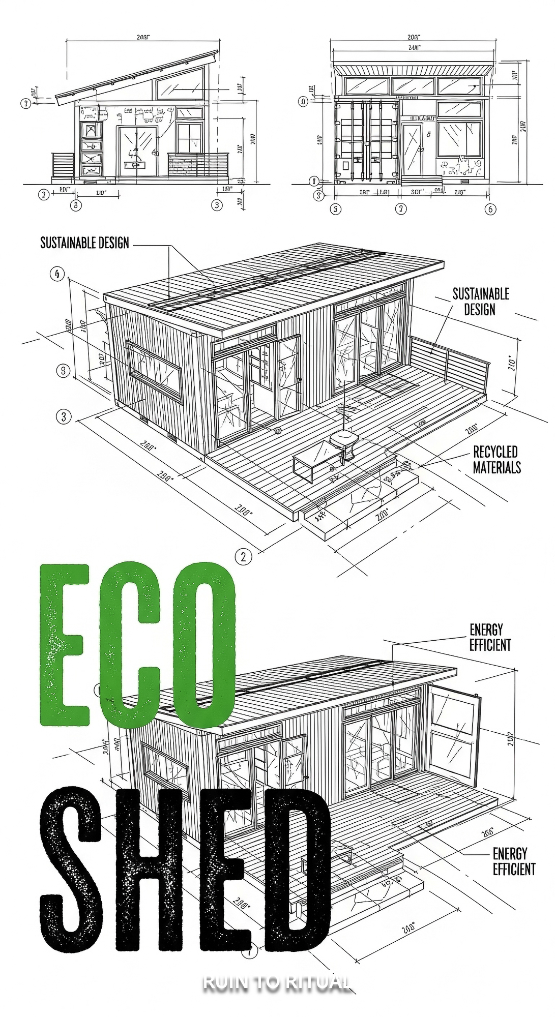 Modern shipping container shed design blueprint style text overlay Eco Shed