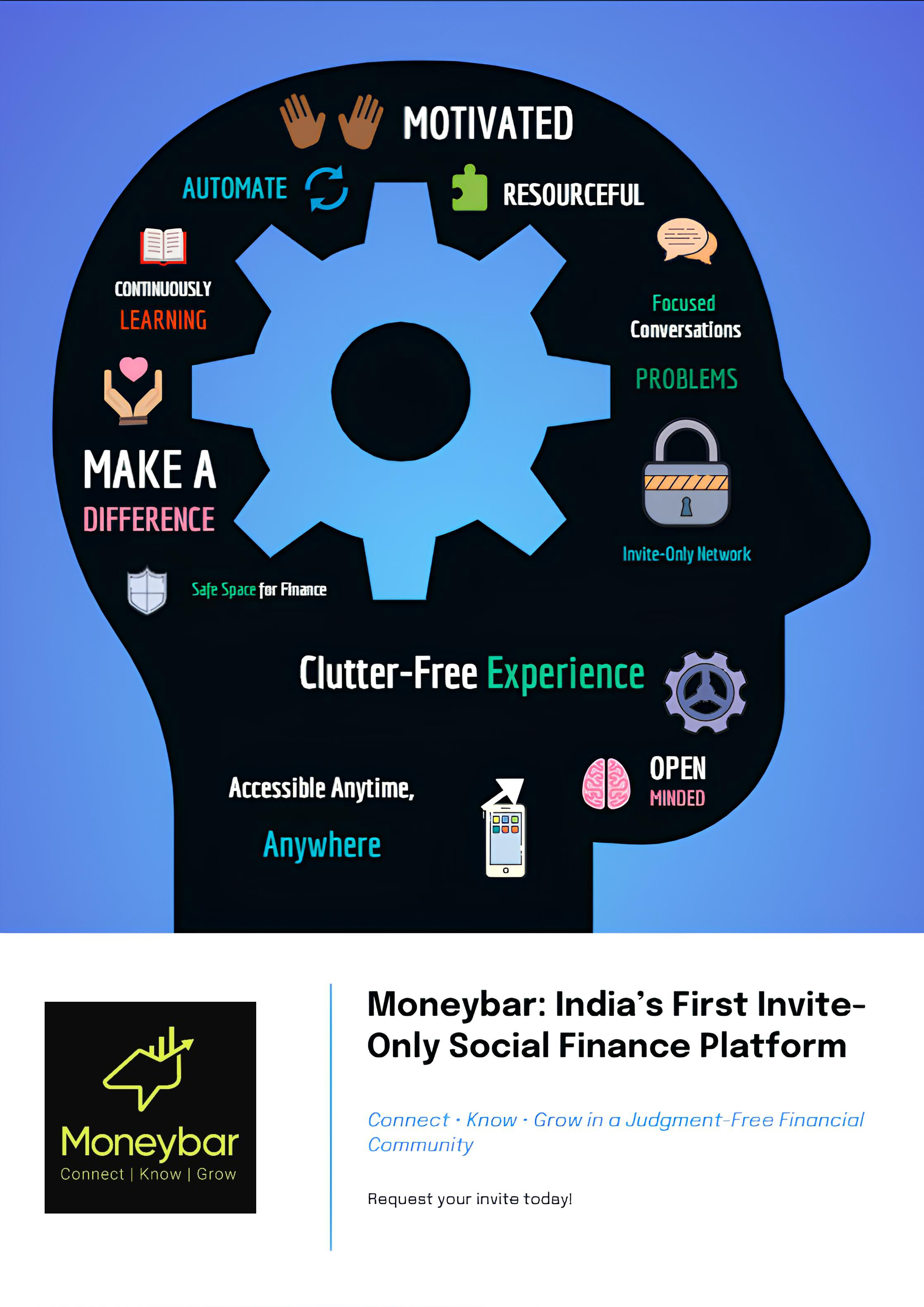This infographic highlights the core values and features of Moneybar, a unique social finance platform in India designed for open, clutter-free, and judgment-free financial conversations.