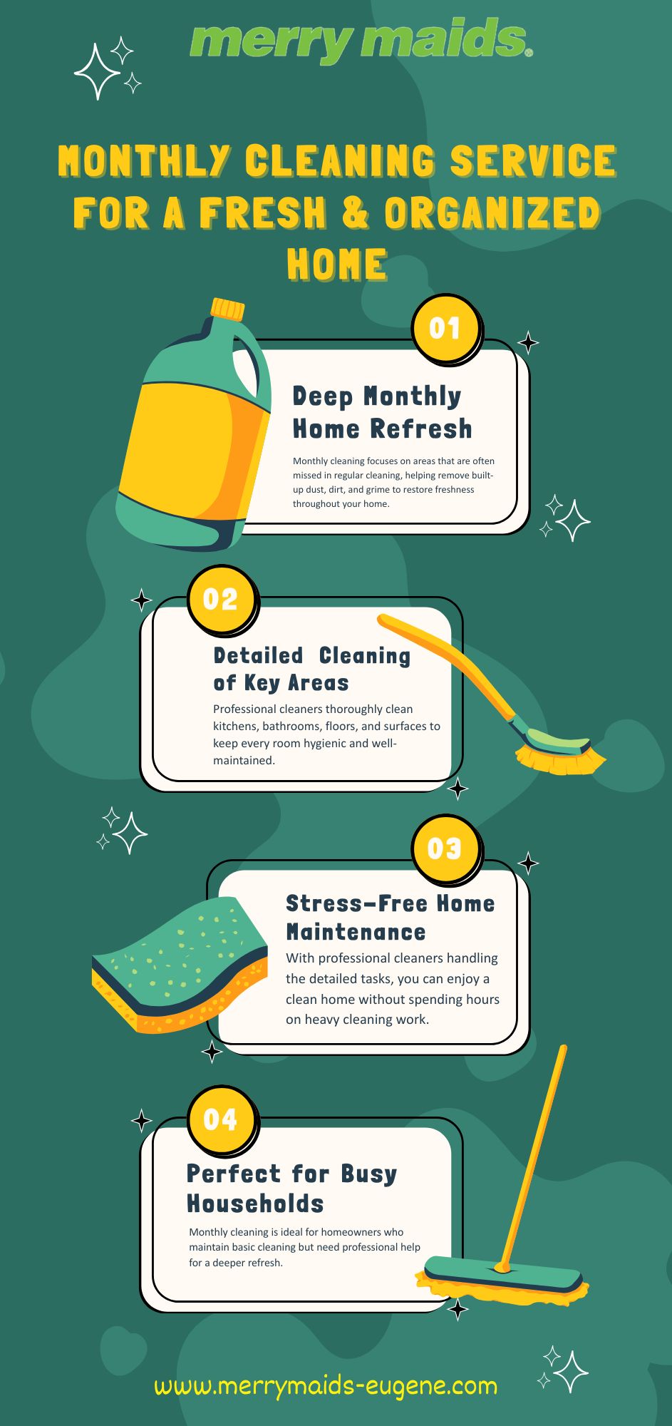 Maintain a cleaner, healthier home with professional monthly cleaning services. Enjoy deep cleaning of important areas that keeps your living space fresh and stress-free. https://merrymaids-eugene.com/services/monthly-cleaning-service/