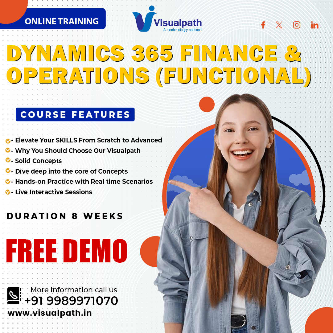 Visualpath offers D365 Training. The Dynamics 365 Course covers essential functional aspects, including financial management, supply chain operations, and human resources processes. Designed for both beginners and professionals, Our Microsoft Dynamics 365 Training is available in Hyderabad and is provided globally. Call us at+91-9989971070