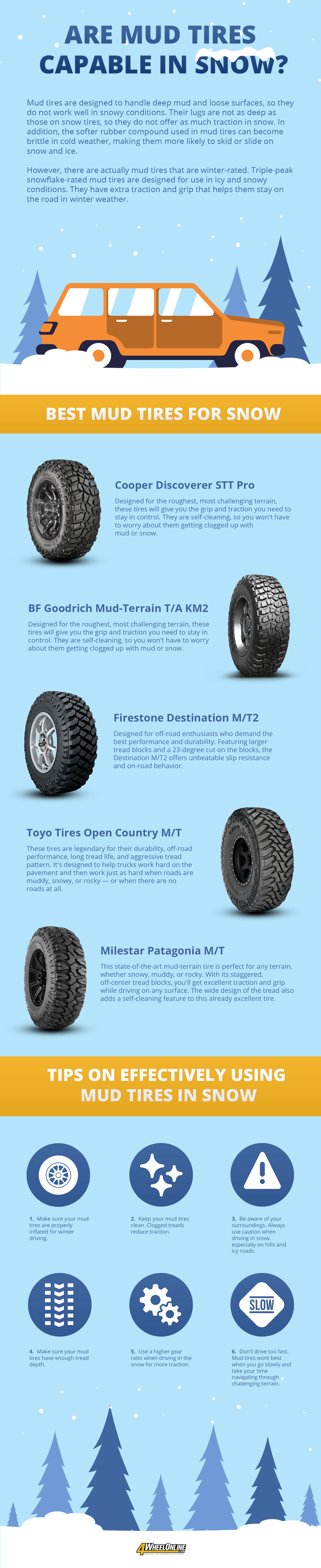 Few tips from 4Wheelonline on using the mud tires on navigating snowy roads and trails