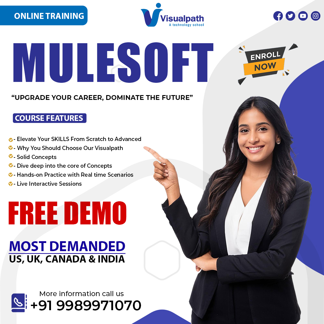 Unlock your potential with expert-led MuleSoft Training in Ameerpet at Visualpath. Our comprehensive Mulesoft Training Insititute in Hyderabad equips you with essential skills for seamless integration solutions. Start your journey with hands-on learning to become a certified MuleSoft professional. Call +91- 9989971070