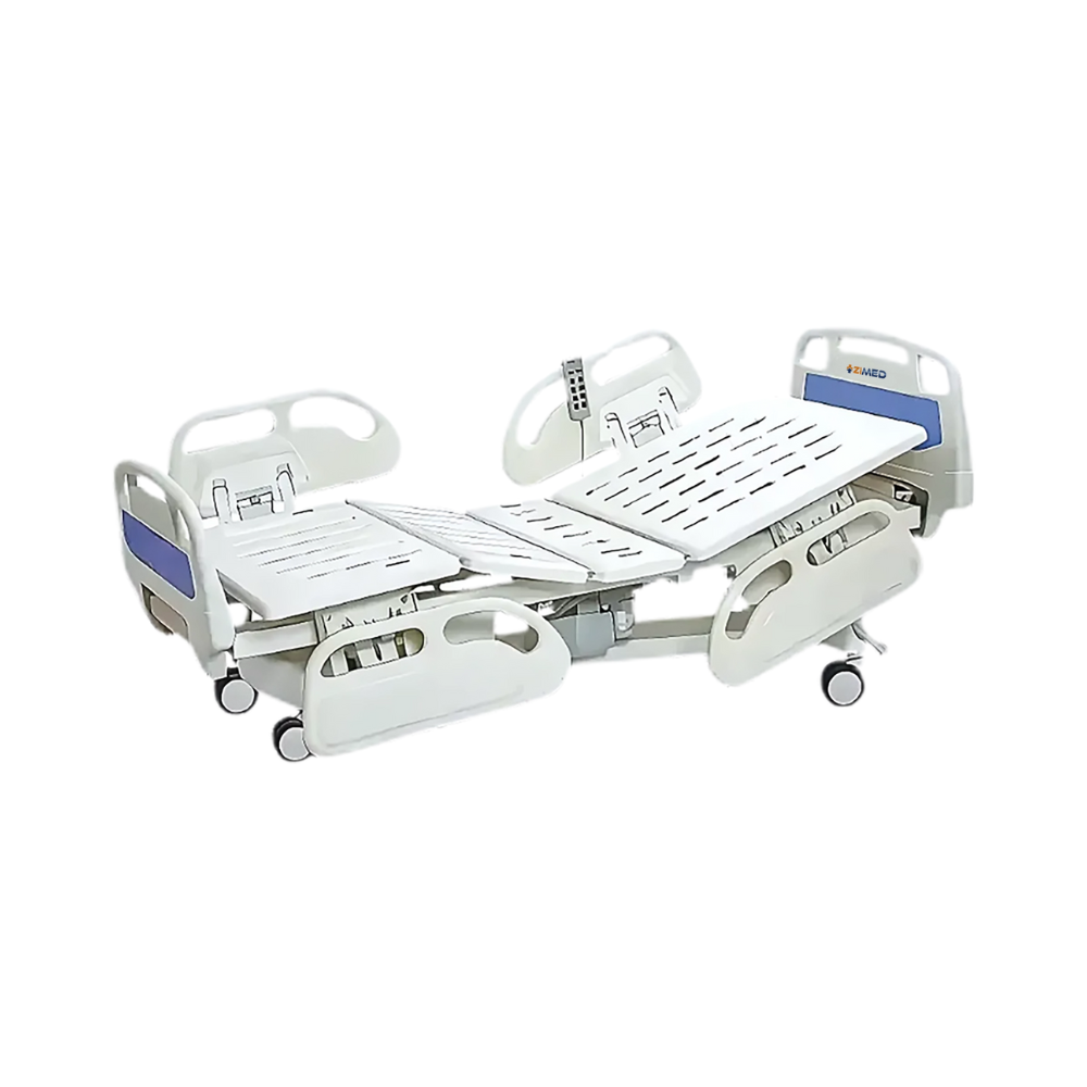 Zimed Multi-functional Electric Hospital Bed supports up to 250 kg with washable stainless steel, plastic head/foot boards, and a perforated mattress base. Features CPR, Trendelenburg, and simultaneous back/leg rest adjustment. LED weight scale, central casters, and battery-backed safe motor ensure reliability.
