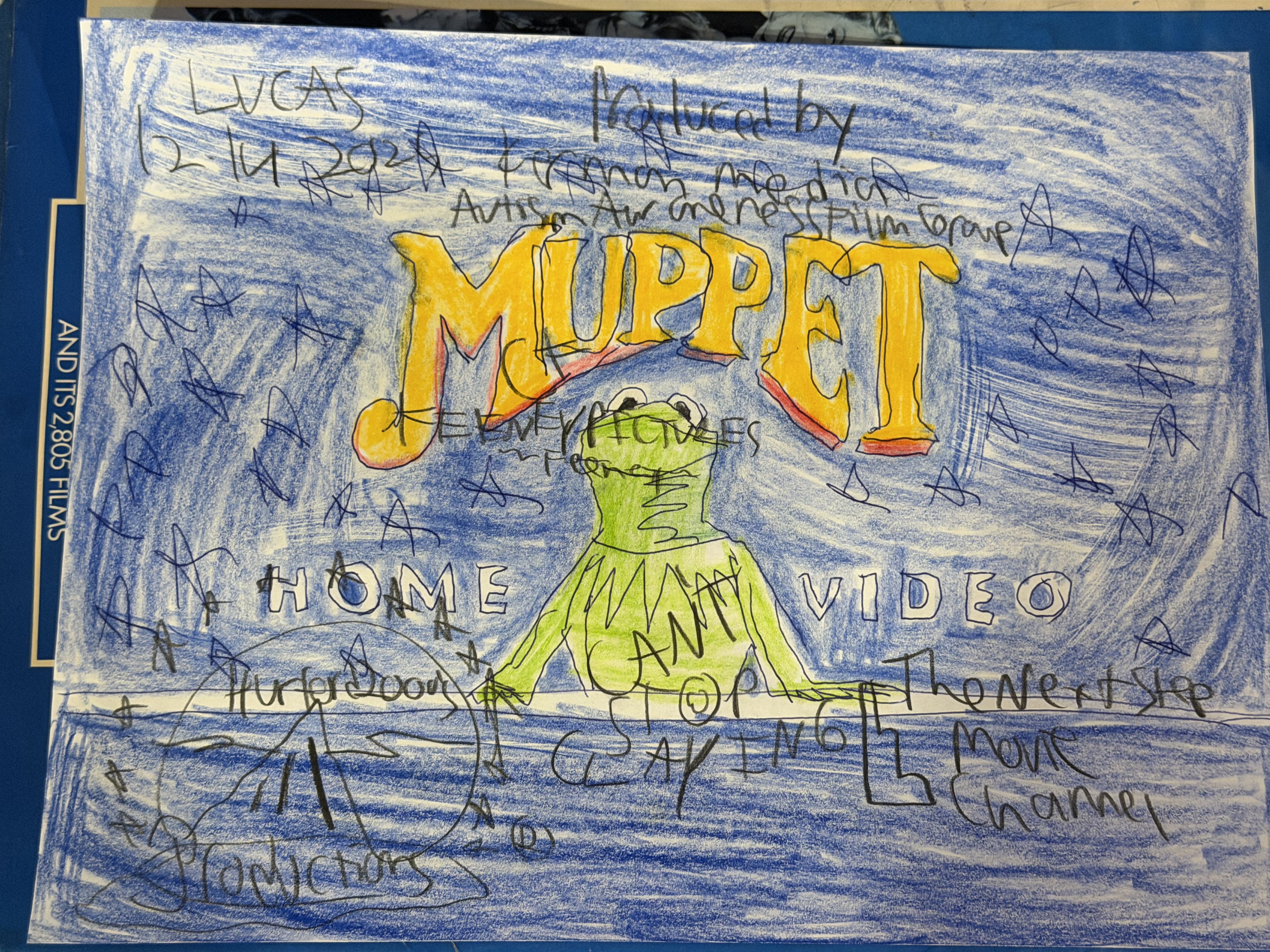 On a navy blue space background, a white line draws along the bottom, of which an odd white outline blob pops up in the middle. It's filled in to reveal Kermit the Frog, who stares in awe as two comets shoot over his head in opposite directions. A star faintly pings in the top left, and the arched large text reading "MUPPET", in a font similar to the logo for The Muppet Show and colored yellow-orange with a red backing, flies in and settles over Kermit. White text reading "HOME-VIDEO" then fades in below with Kermit between both words. He then stares at them and nods his head before fading out.[CONTENT NOT FOR REUSE AND IT'S ALSO NOT APPROPRIATE FOR LOGO KIDS AND POSITIVE PEOPLE, IF ANYONE USES MY WORK, EVEN WITHOUT PERMISSION FROM ME AND ALSO USING FOR LOGO EFFECTS AND HORROR LOGO REMAKES WILL BE FORCED TO GET TAKEN DOWN, YOU DO NOT EVER HAVE MY PERMISSION TO USE MY STUFF, EVEN DOWNLOADING TO YOUR PERSONAL PRIVATE DEVICES]