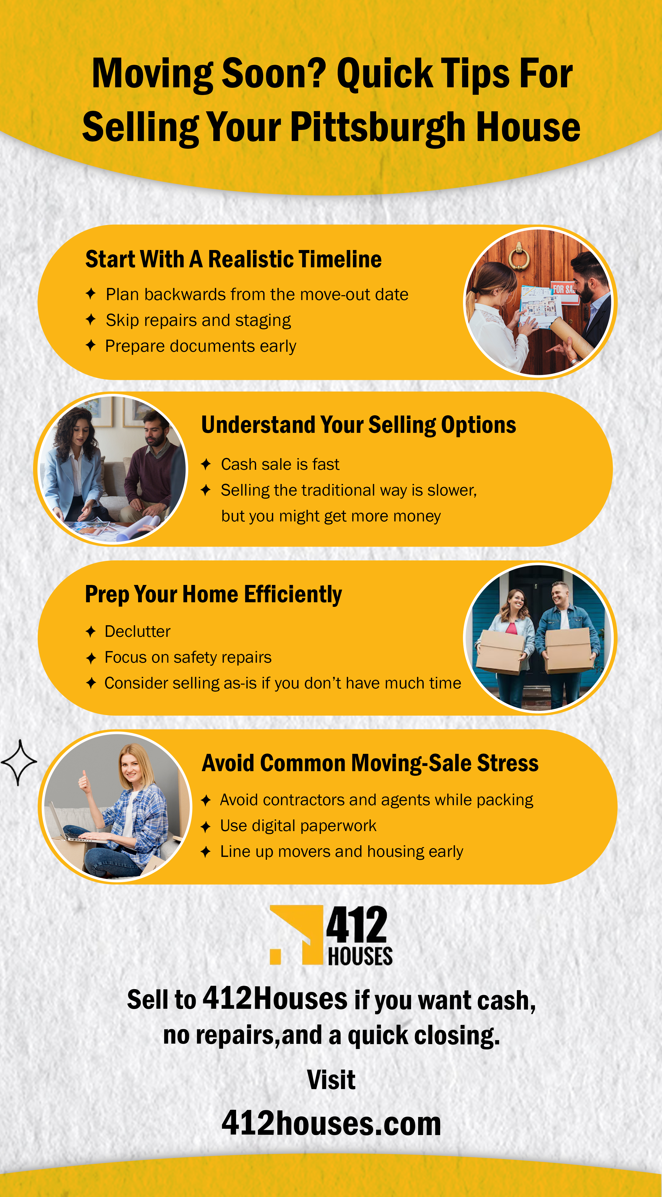 This infographic highlights the key steps to follow when selling your Pittsburgh home quickly before an out-of-state move. And if you’re looking for the fastest option, check out 412Houses. We buy houses in Pittsburgh as-is and for cash. Close in as little as two weeks with us. To learn more, visit: https://www.412houses.com/.