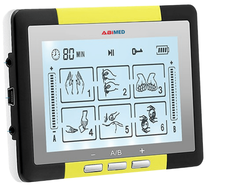 Abimed Nerve Stimulator offers a four-inch touch screen LCD with six massage modes, twenty intensity levels, and four channels. It is made from ABS and aluminum alloy and features a compact design with eight pads, four leads, a USB cable, and a touchscreen pen, providing versatile and effective pain relief.