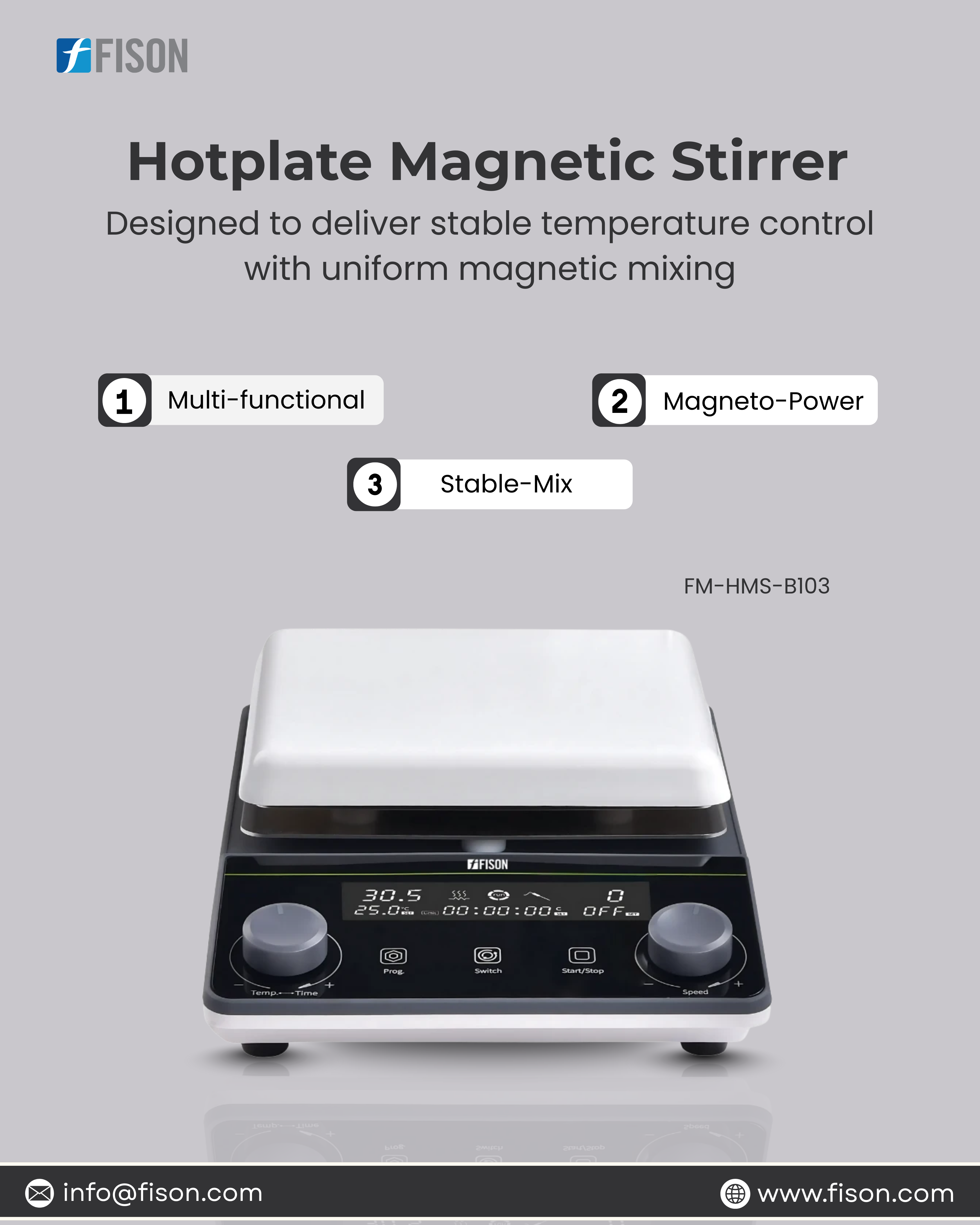 Hotplate Magnetic Stirrer FM-HMS-B103 offers controlled heating and smooth stirring for routine laboratory mixing. Featuring an LCD display, adjustable speed range, and a durable hotplate surface, it supports consistent solution preparation in daily lab workflows.