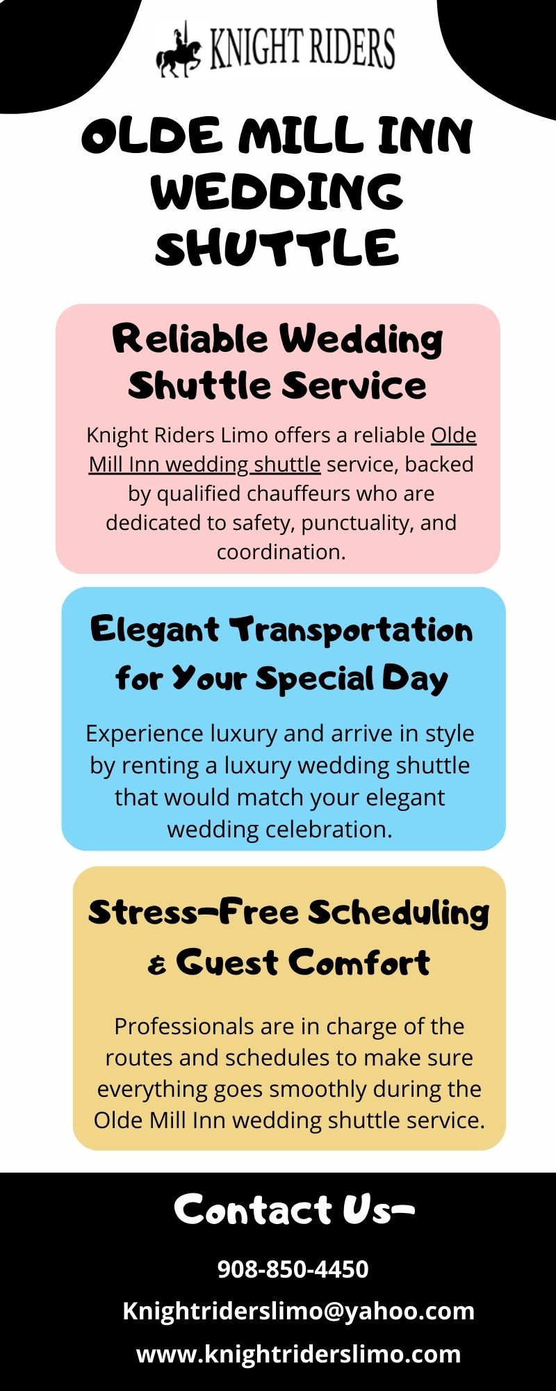 Knight Riders Limo offers a professional Olde Mill Inn wedding shuttle service focused on safety, comfort, and punctuality. With experienced chauffeurs and luxury vehicles, we ensure smooth transportation for your wedding day. For more, visit: https://www.knightriderslimo.com/wedding-service