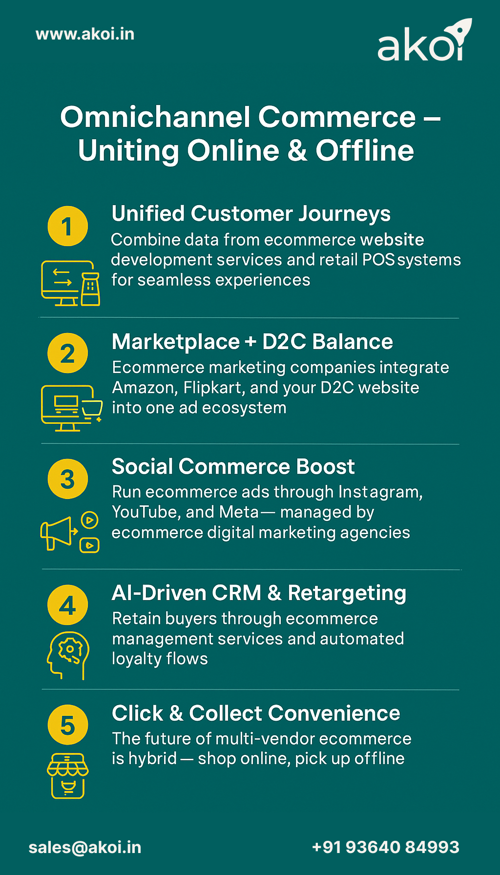 Deliver a unified brand experience across your ecommerce website, mobile app, retail POS, and marketplace channels. Akoi helps brands build scalable digital ecosystems through ecommerce website development, marketplace advertising, social commerce campaigns, CRM automation, and hybrid click-and-collect solutions—designed for modern D2C and enterprise growth.