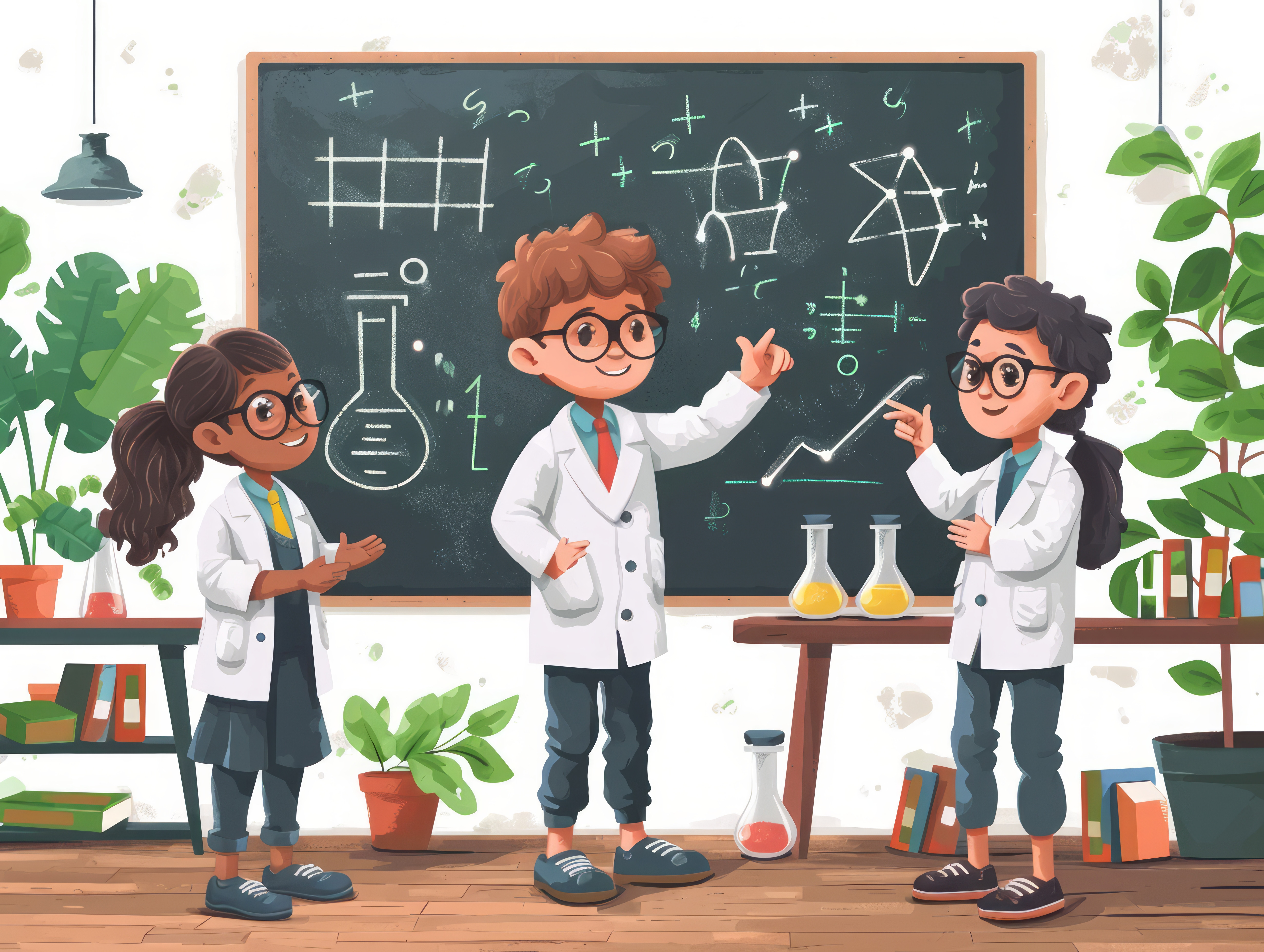 pastel colors white background isolated Crazy scientist points to formulas written on blackboard and