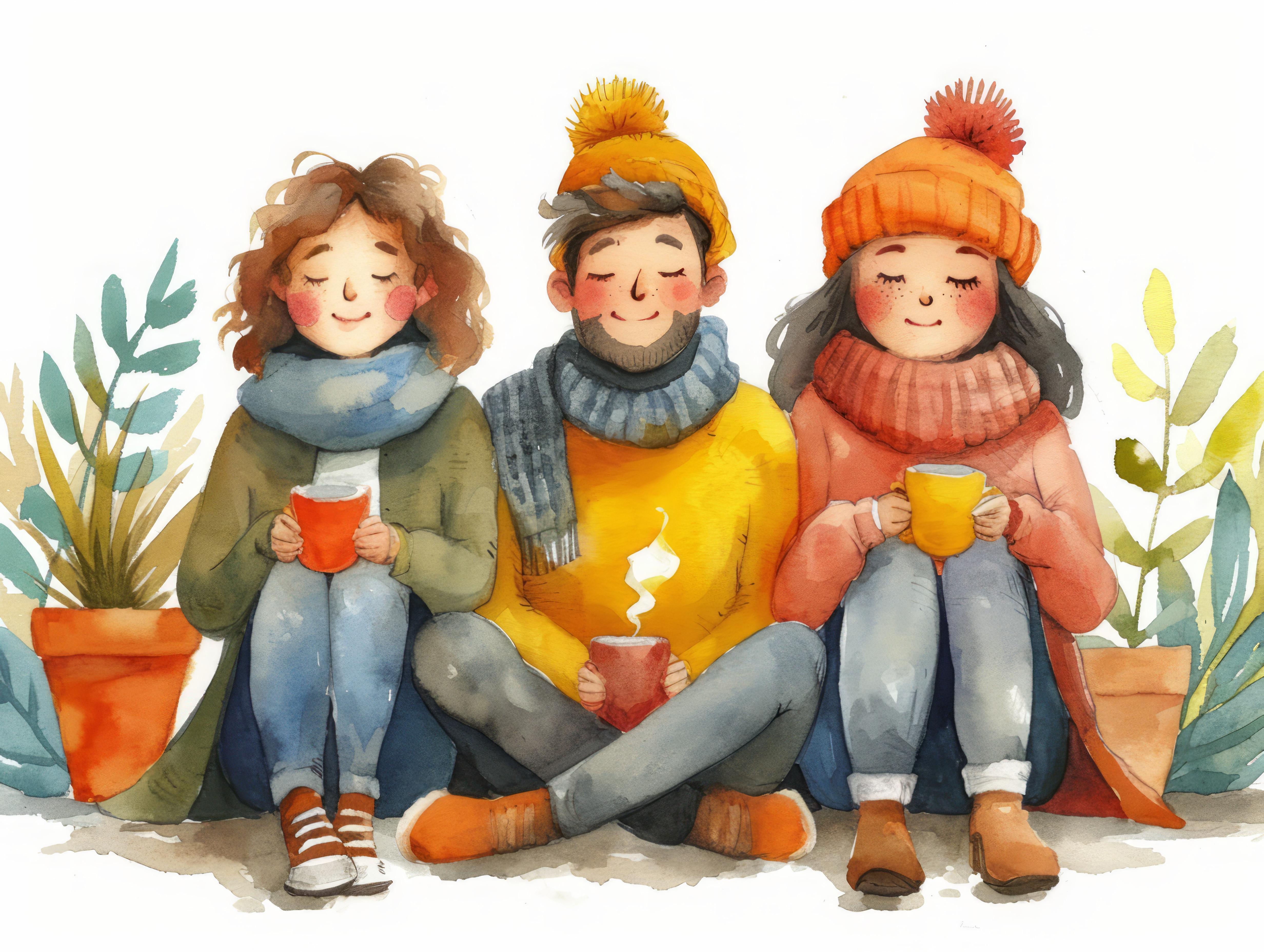 pastel colors white background isolated Diverse friends enjoy warm drinks relax on weekend illustrat
