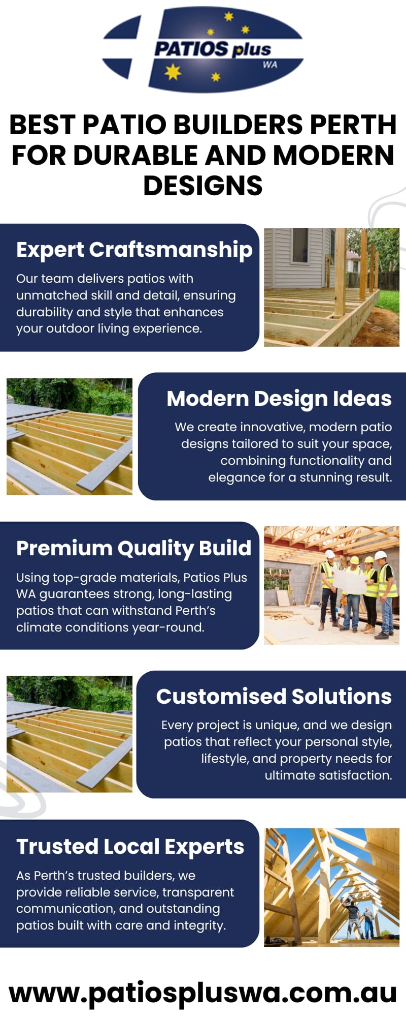 With the help of patio builders Perth, who can create long-lasting, fashionable, and useful designs that fit your lifestyle, you can transform your outside area. Our staff guarantees excellent craftsmanship and long-lasting results whether you're looking for a contemporary alfresco space, a cool retreat, or a useful carport. At Patios Plus WA, we take great satisfaction in enhancing your home's comfort and value by utilising high-quality materials and cutting-edge processes. We ensure a smooth procedure from design to installation thanks to our years of experience. Get in touch with reputable patio builders in Perth right now. Get in touch with us at 61 8 9302 1600 to begin designing the outdoor living area of your dreams. Visit Now, https://patiospluswa.com.au/patio-builders-perth/