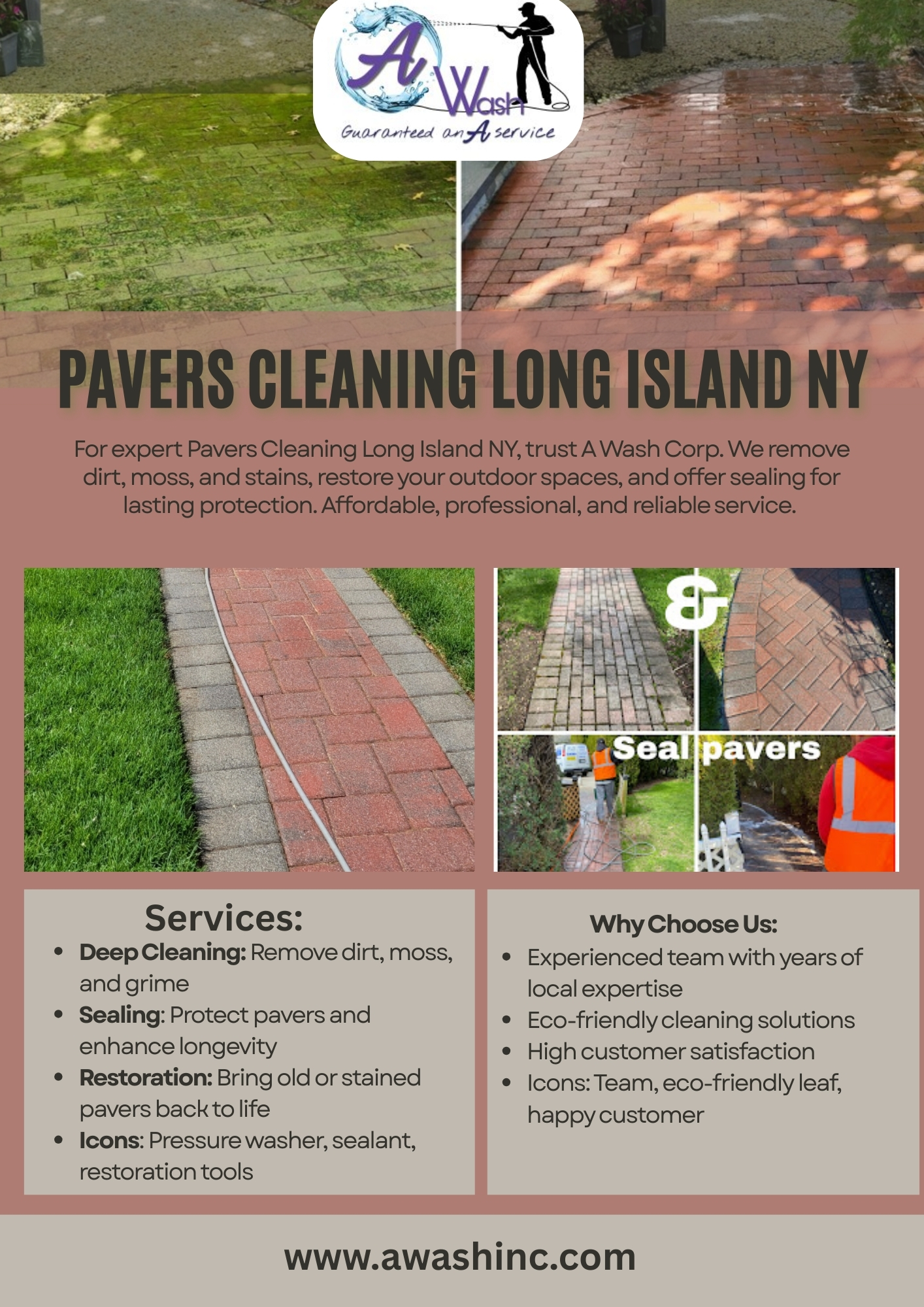 For expert Pavers Cleaning Long Island NY, trust A Wash Corp. We remove dirt, moss, and stains, restore your outdoor spaces, and offer sealing for lasting protection. Affordable, professional, and reliable service. Call (516)-589-1179 today to schedule your pavers cleaning and transform your patios, driveways, and walkways.