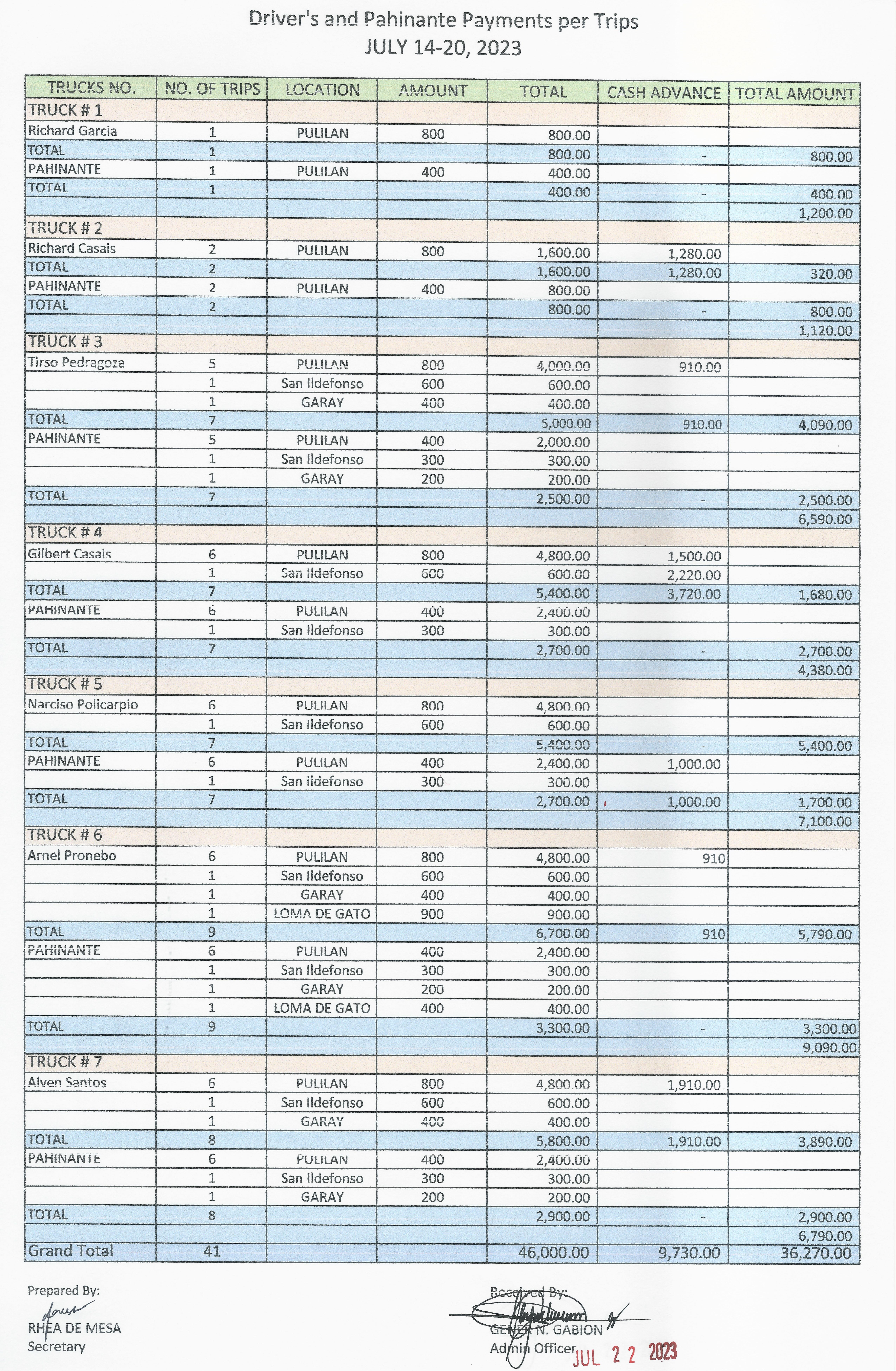 Payment Trips July 14 20, 2023 = Php 36,270