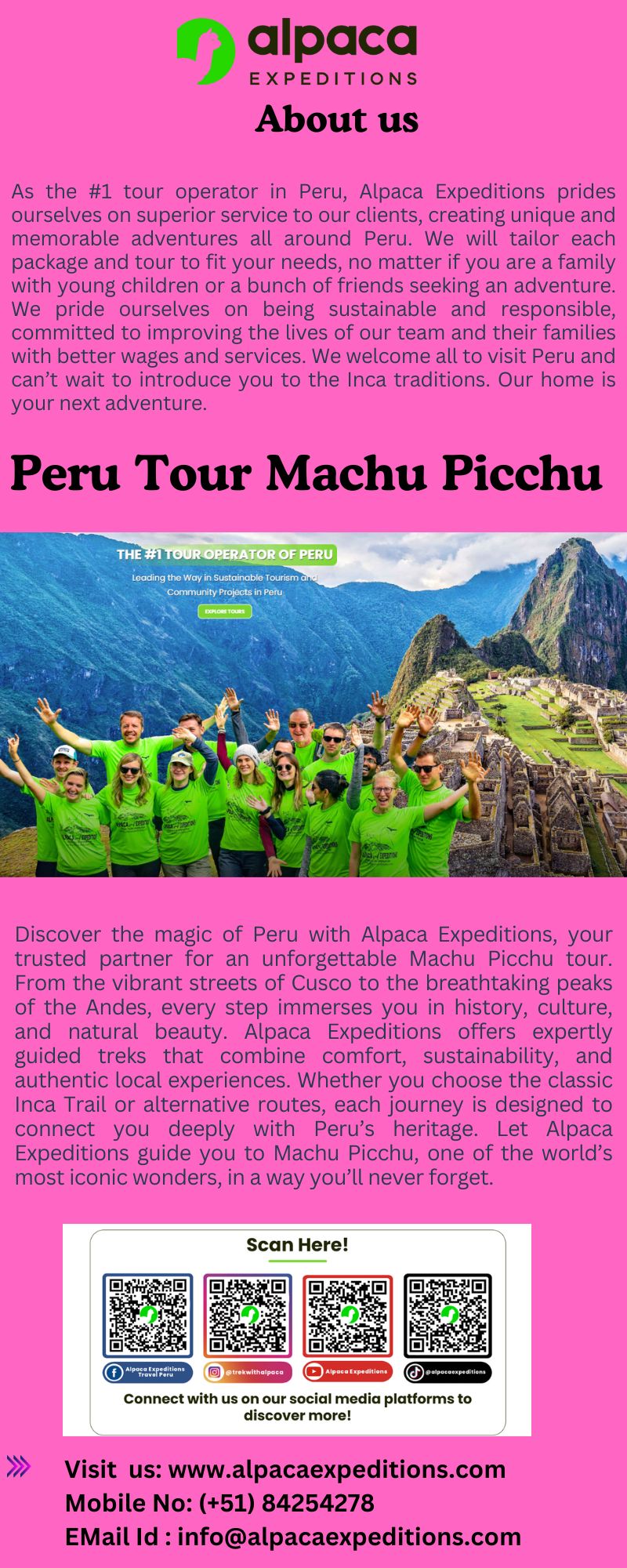 Discover the magic of Peru with Alpaca Expeditions, your trusted guide to Machu Picchu. Our carefully crafted tours take you beyond the surface, offering authentic experiences that connect you to the rich history, culture, and breathtaking landscapes of the Andes. Whether you choose the classic Inca Trail, alternative routes, or a customized journey, we ensure every step is guided with care, comfort, and local expertise. With Alpaca Expeditions, you don’t just see Machu Picchu—you experience it fully. Let us lead you on an unforgettable adventure through one of the world’s most iconic wonders.