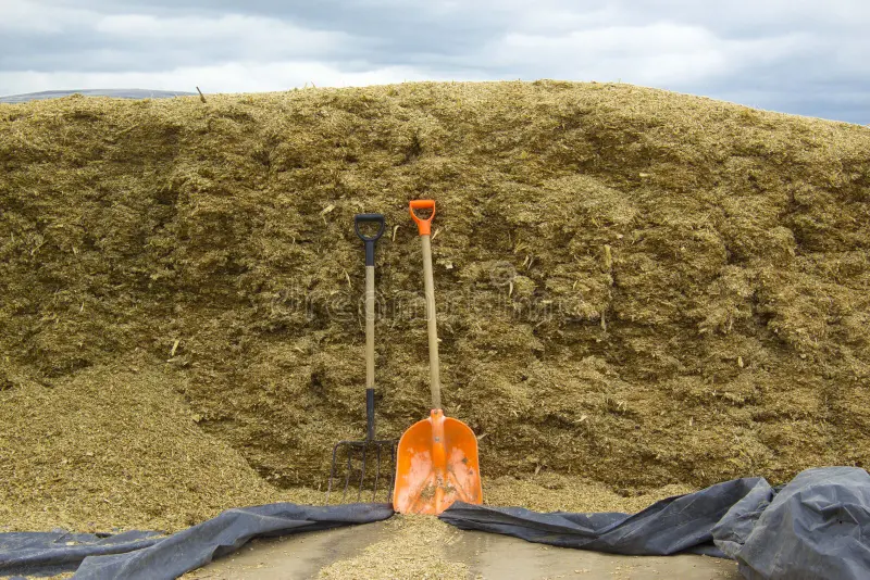 pile corn straw sawdust bedding cows barn shovel pitchfork loading site dairy farm caring 182426458