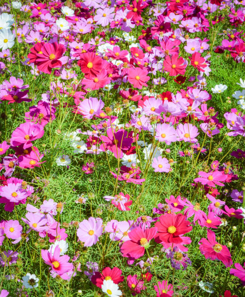 pink and white cosmos field beautiful spring flowers garden blossom on bright day colorful plant bac