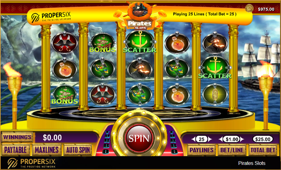 O ProperSix Pirates Slots Machine é simples de jogar com imagens e sons clássicos e os métodos de algoritmo da máquina real! Você experimentará efeitos especiais um após o outro, Grande vitória, Mega vitória, Super vitória, Sweep limpo e Jackpot. Concorra ao grande jackpot do ProperSix com jogadores de todo o mundo! 25 linhas de pagamento em cinco cilindros no jogo regular oferecem a chance perfeita de ganhar Twists. O jogador pode escolher um mínimo de uma linha de pagamento e um máximo de 18 linhas de pagamento. O jogador pode escolher a aposta em apenas uma linha de pagamento, de uma aposta mínima à máxima. A lógica do jogo ProperSix é justa e o usuário pode testar no modo de demonstração.