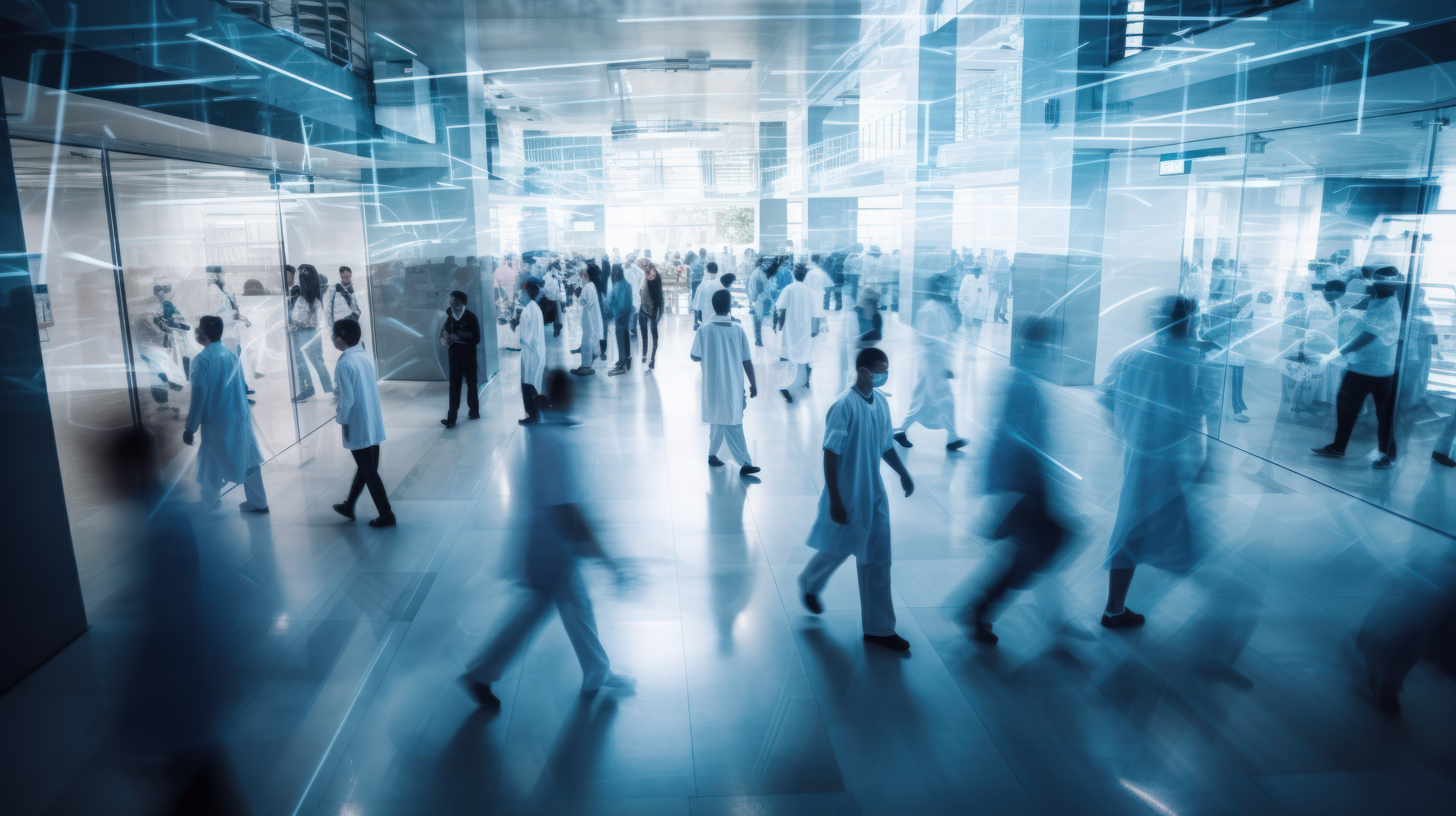 Planning blur or overlay top view of doctors nurse or medical healthcare schedule in clinic lobby Bu