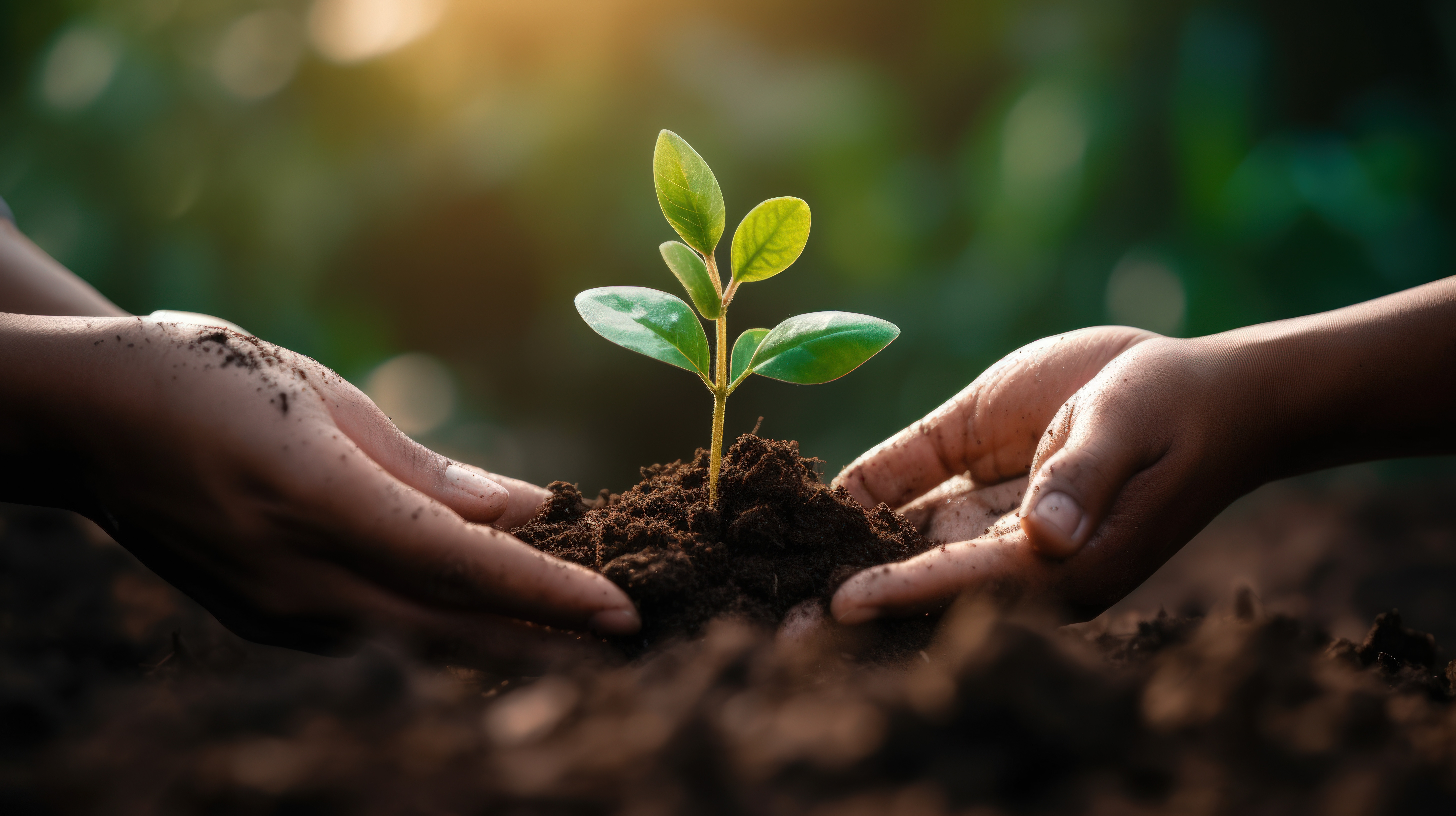 Plant growth and sustainability with people holding a budding flower in soil closeup for conservatio