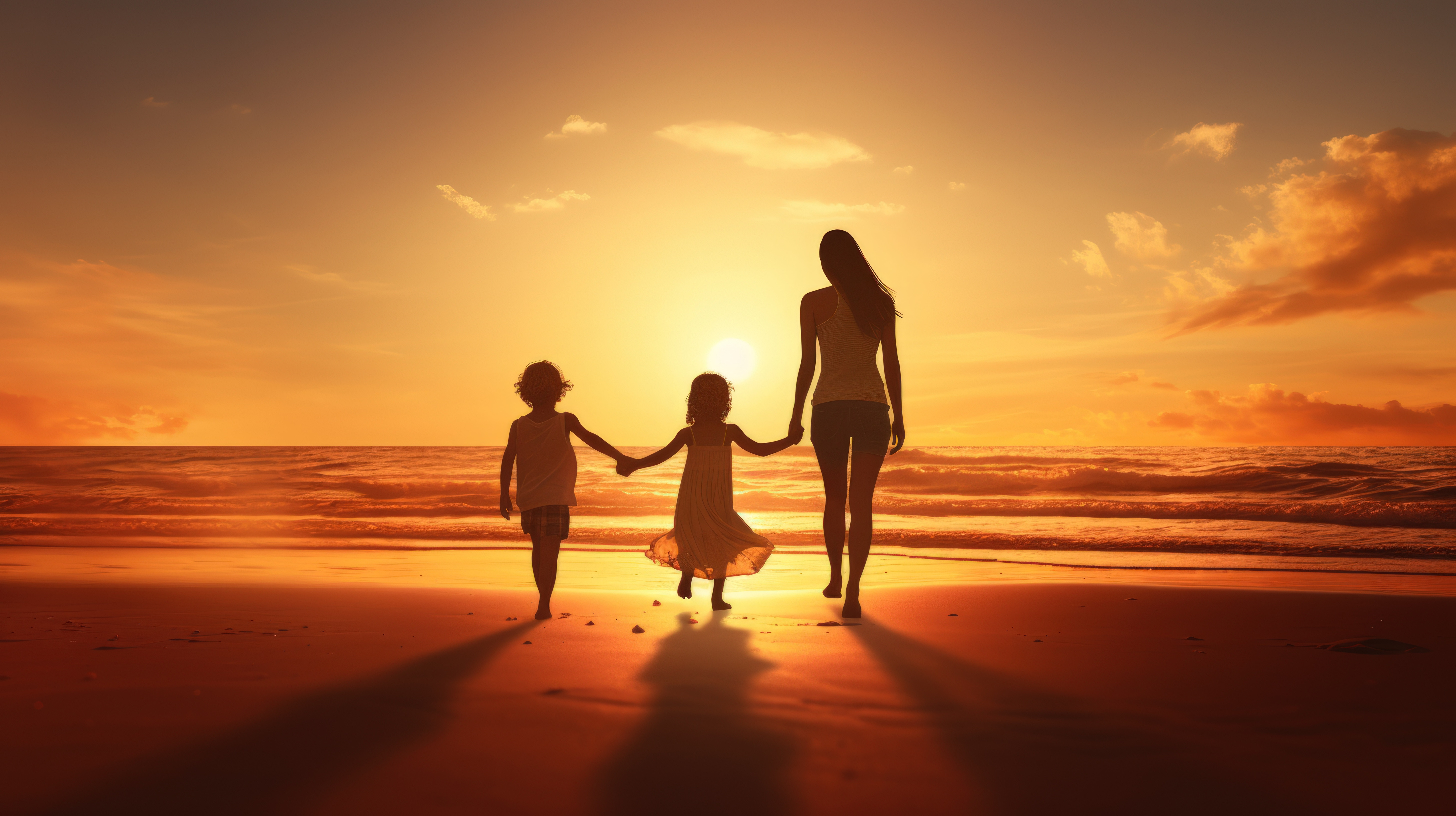 Playing mother and children at beach on a fun family vacation holiday or nature adventure at sunset