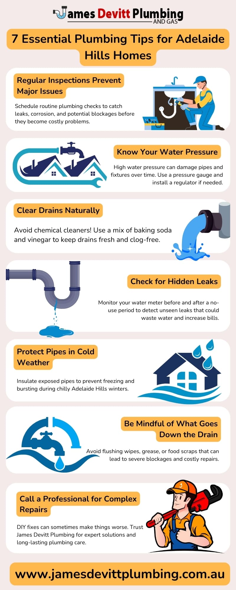 James Devitt Plumbing is your neighbourhood specialist for all residential and commercial plumbing needs, so you can rely on them when you need trustworthy plumbing solutions. Our skilled staff ensures that your plumbing system operates safely and smoothly by providing timely and effective services. We consistently provide high-quality work, whether it's replacing old fixtures, clearing clogged drains, or repairing leaks. We take pride in providing professional and reasonably priced plumbing services that are customised for your residence or place of business as a reputable plumber in Adelaide Hills. Get great plumbing care by calling Plumber Adelaide Hills specialists at (+61 8412099 828) for trustworthy services and knowledgeable guidance. Visit Now, https://jamesdevittplumbing.com.au/plumber-adelaide-hills/