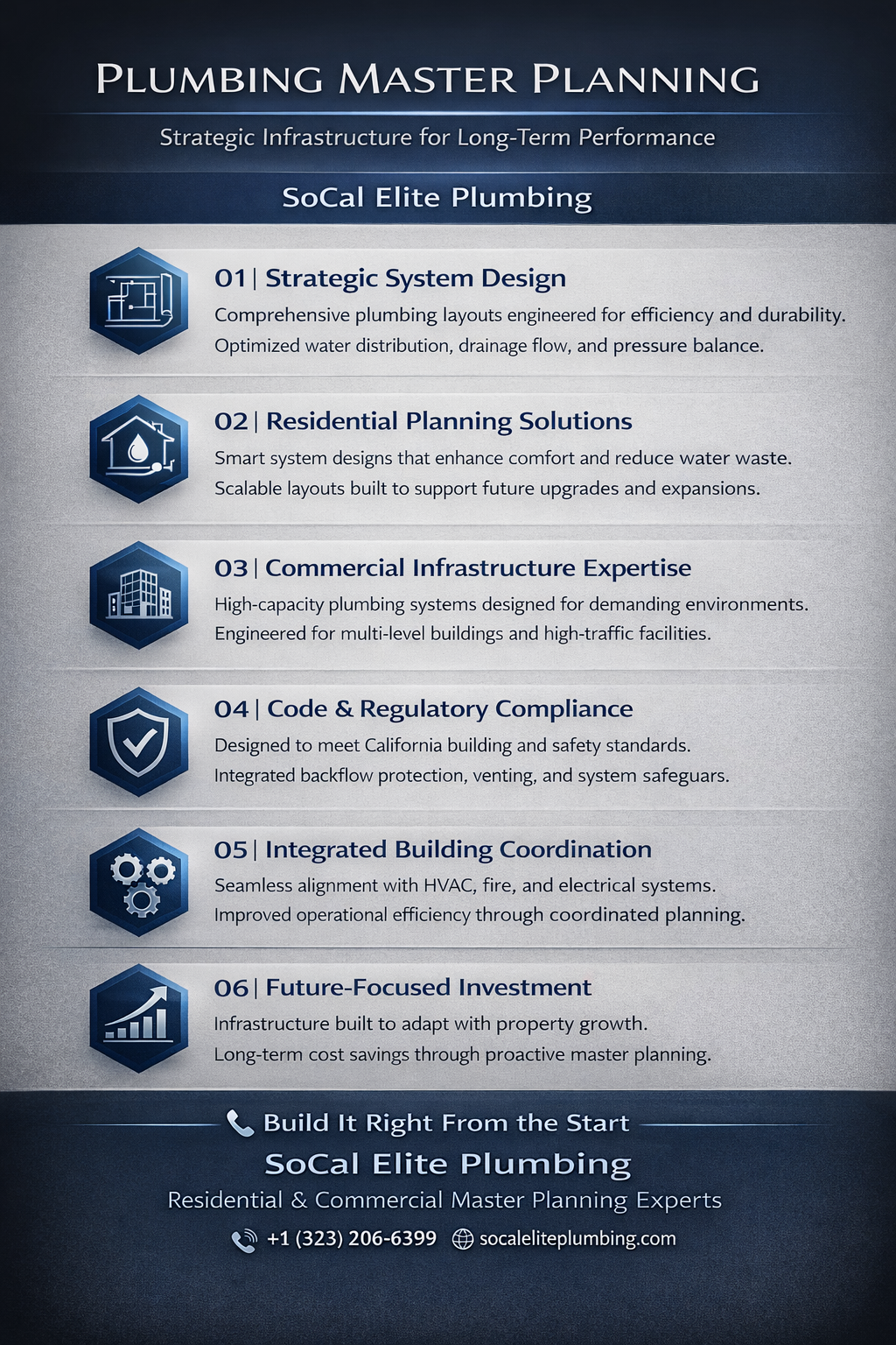 SoCal Elite Plumbing provides comprehensive plumbing master planning services for residential and commercial developments. Our strategic, code-compliant system designs ensure efficient water distribution, proper drainage, and long-term infrastructure performance. From new construction to large-scale renovations, we create future-ready plumbing solutions that support safety, scalability, and operational efficiency.