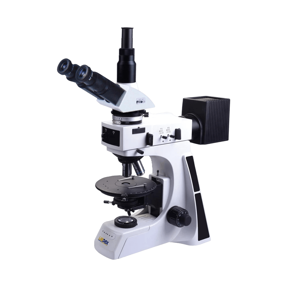 LabDex Polarizing Microscope features an infinity-corrected optical system, trinocular head (IPD 50–75 mm), strain-free swing-out condenser, polarization attachment, and rotatable center-adjustable stage. Includes LED reflected/transmitted illumination for geology, forensics, petrography & metallurgy.