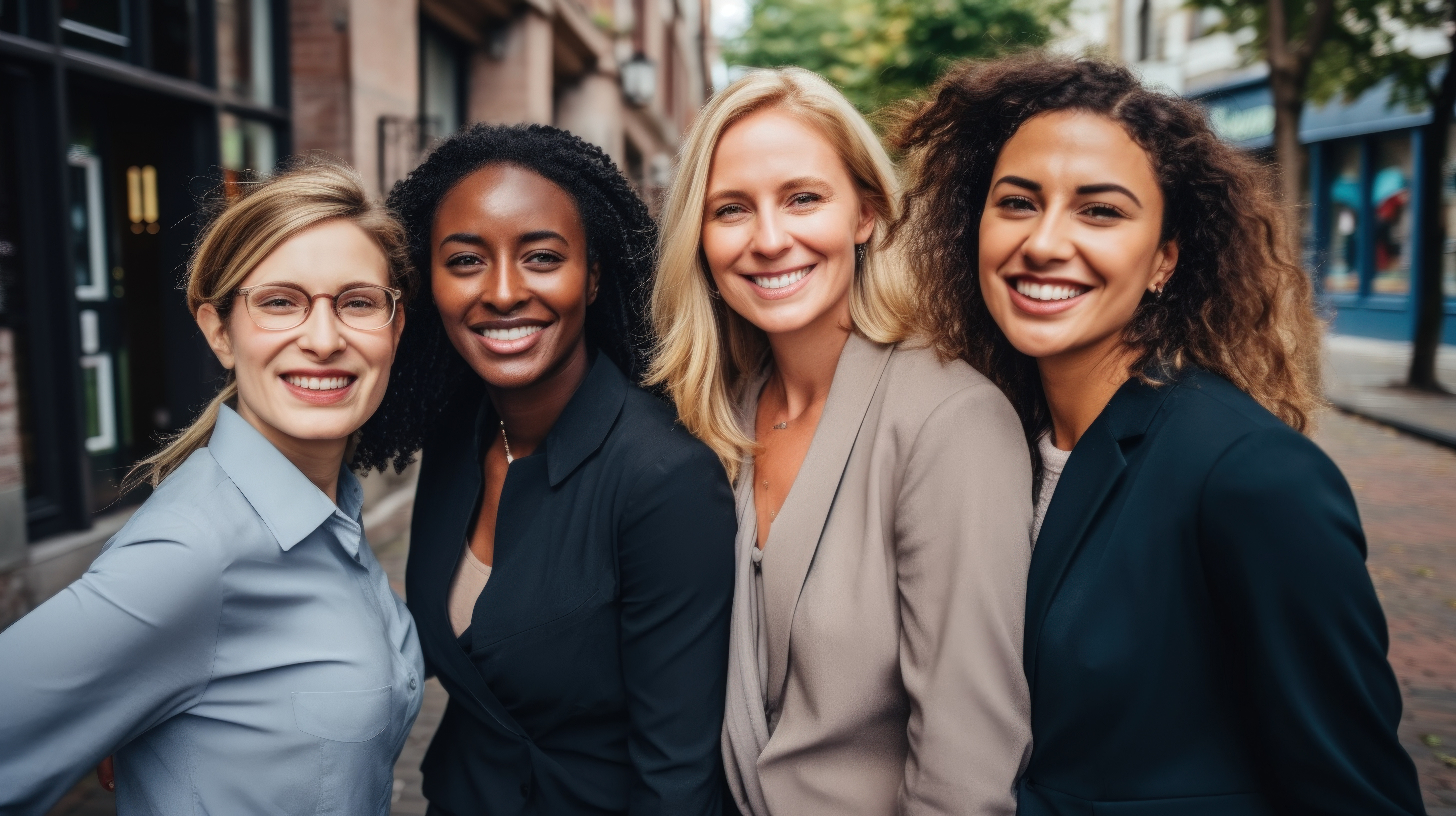 Portrait group and business women smile standing on brick wall with mockup outdoors in city Cooperat
