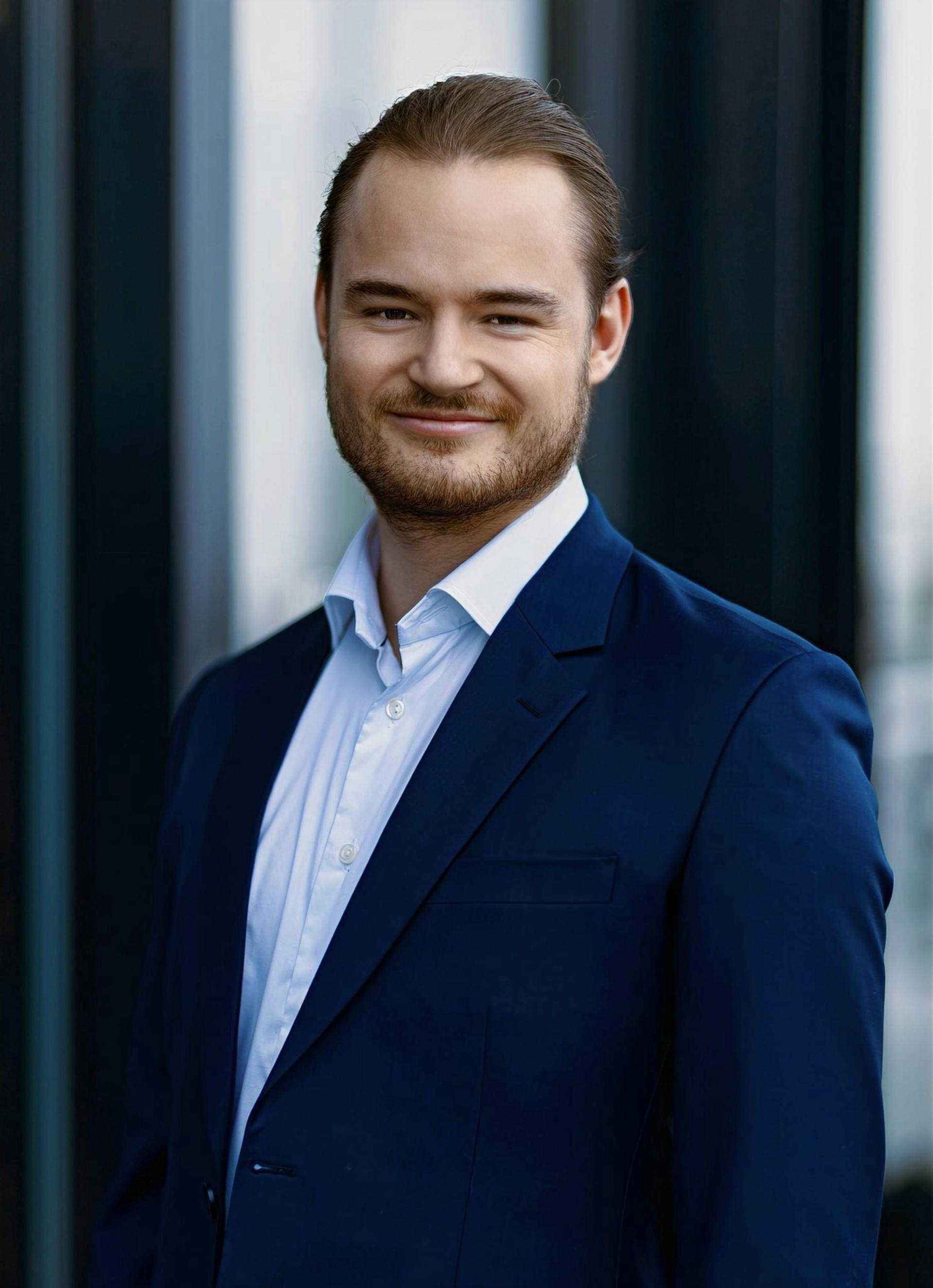 The image shows a young man standing in front of a modern glass building